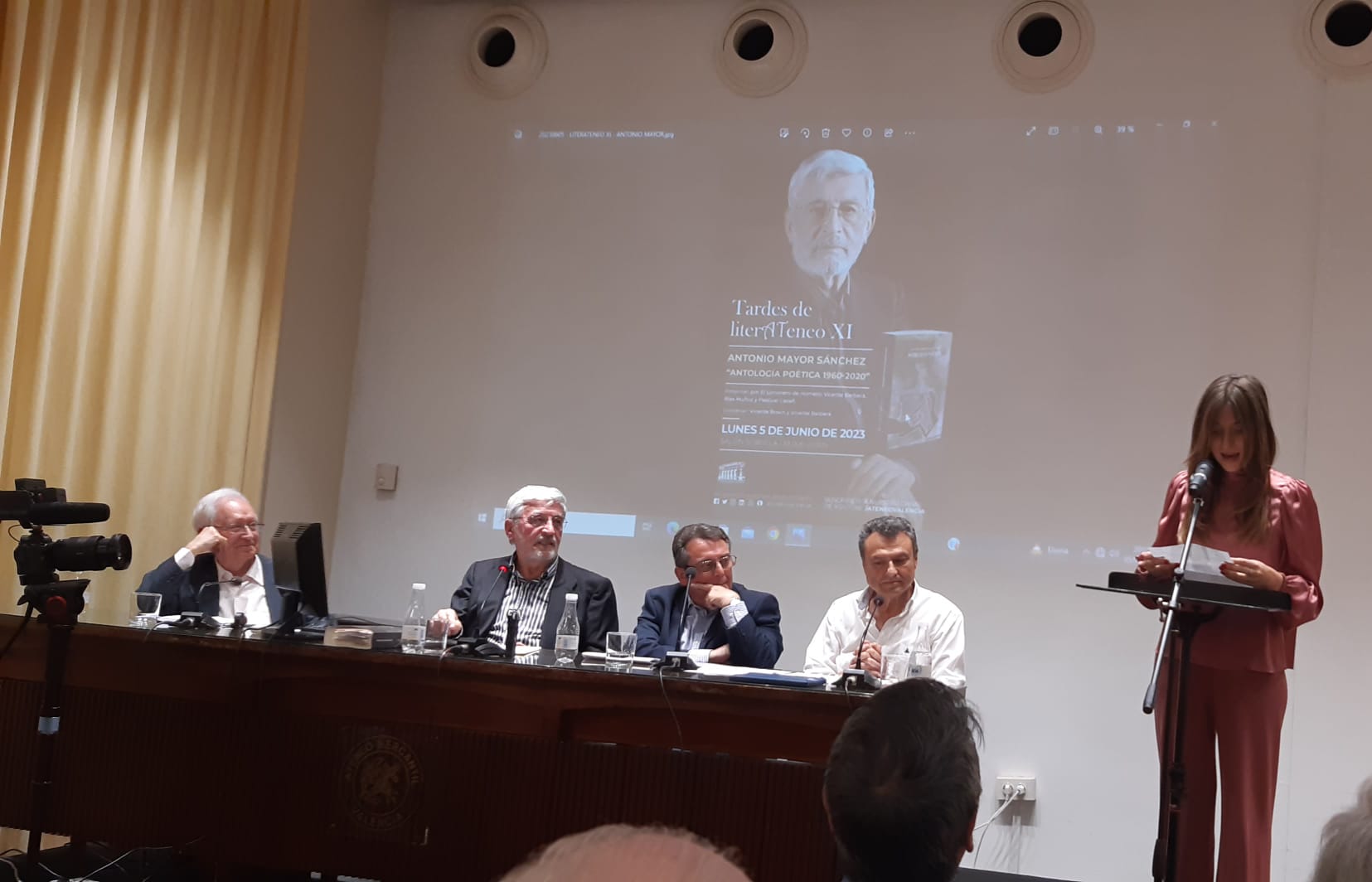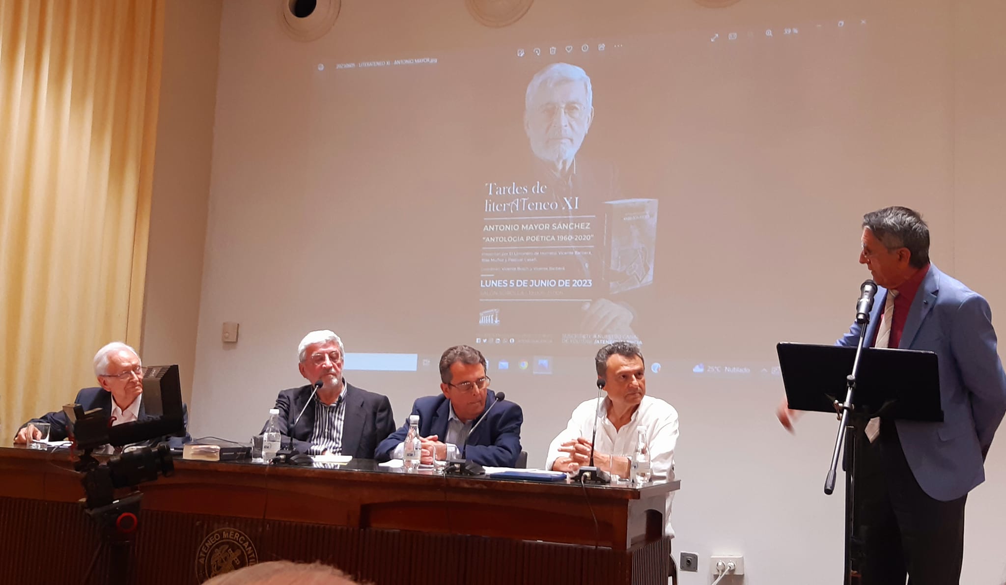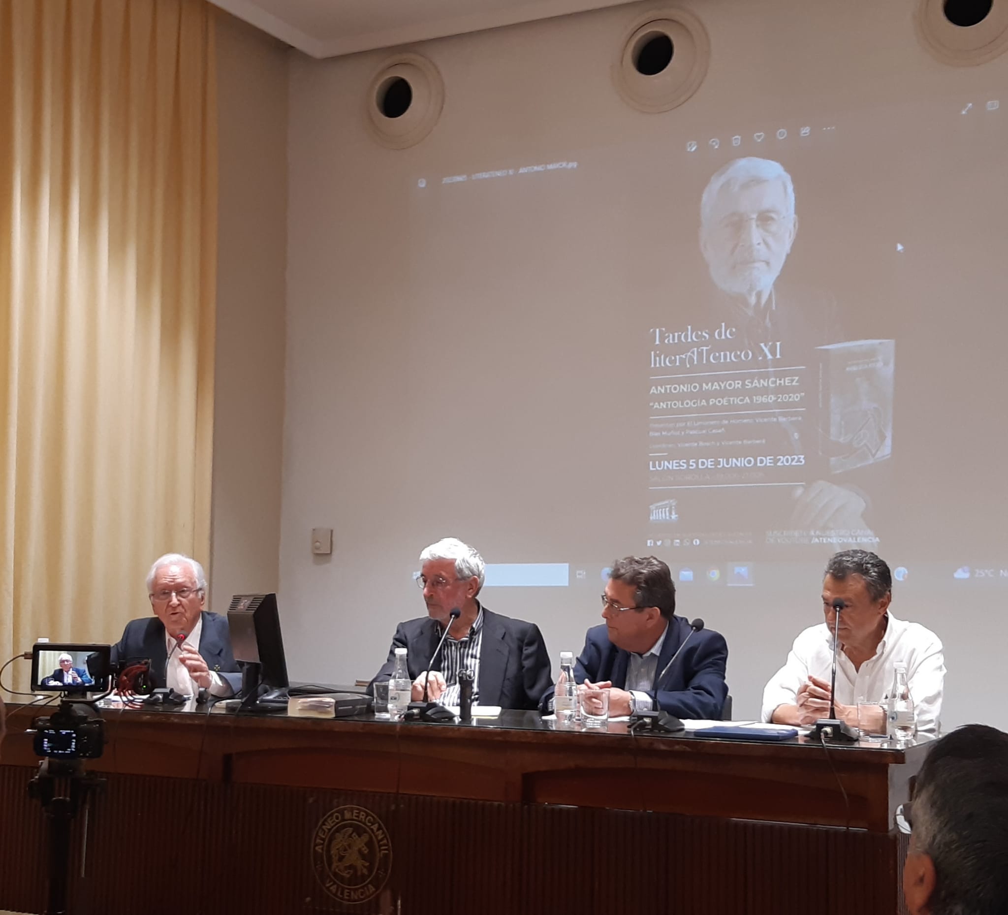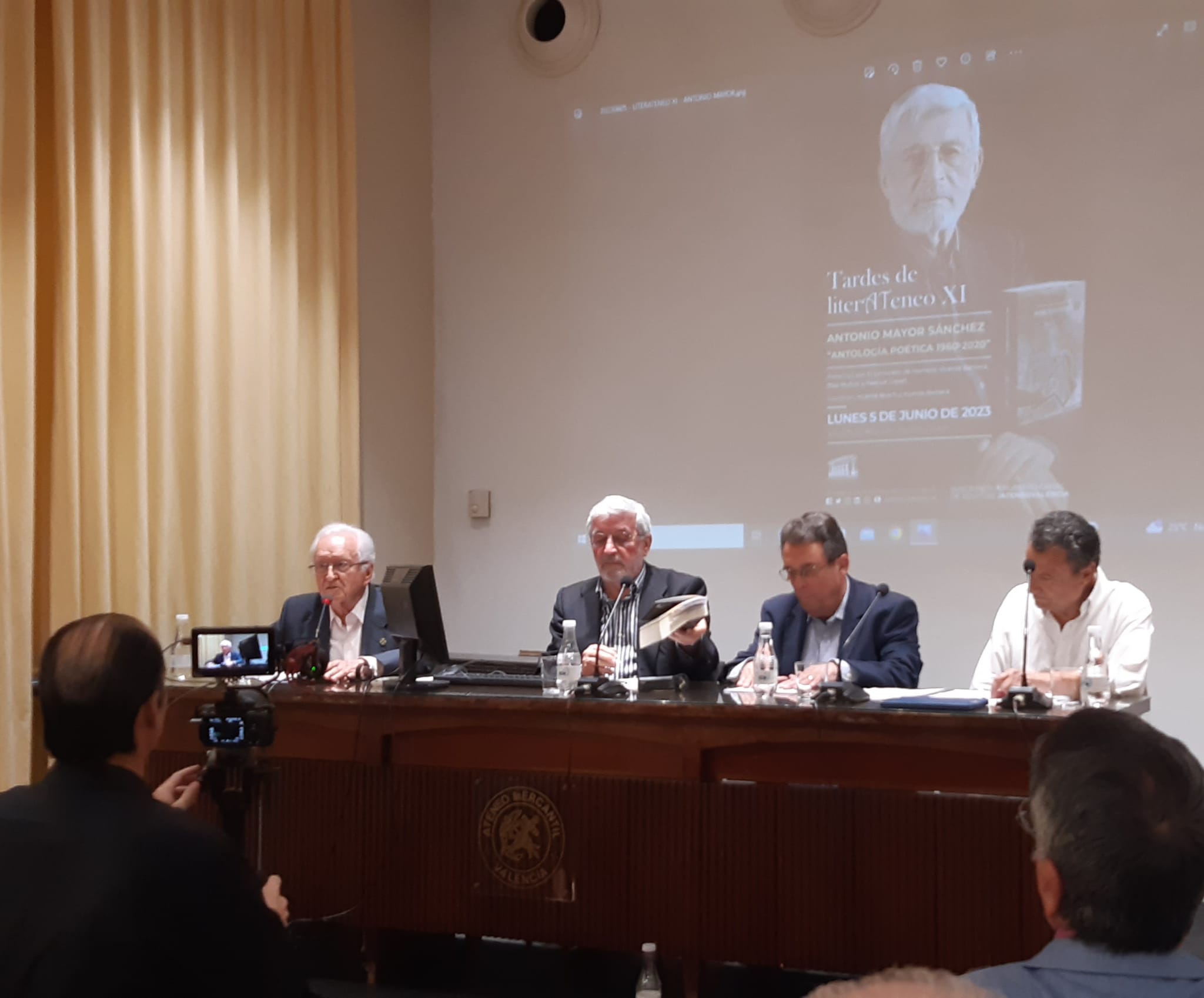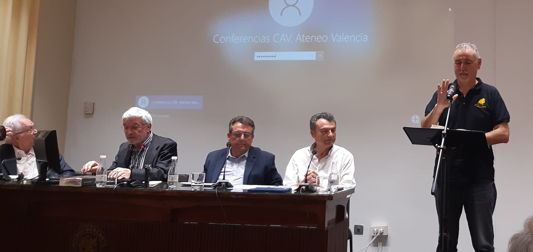 Sabía que habría gente y cuando entré al salón Sorolla del Ateneo de Valencia mis suposiciones se confirmaron. Muchos y muchas de los asistentes estaban ya sentados en las sillas del público, dos de los actuantes de la tarde, Antonio Mayor Sánchez y Blas Muñoz Pizarro en la mesa habilitada en la tarima para el acto y mucha gente saludándose de pie a lo largo de todo el salón.