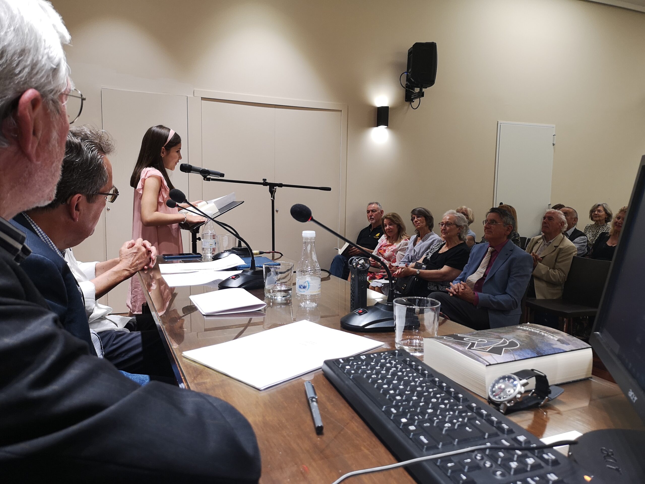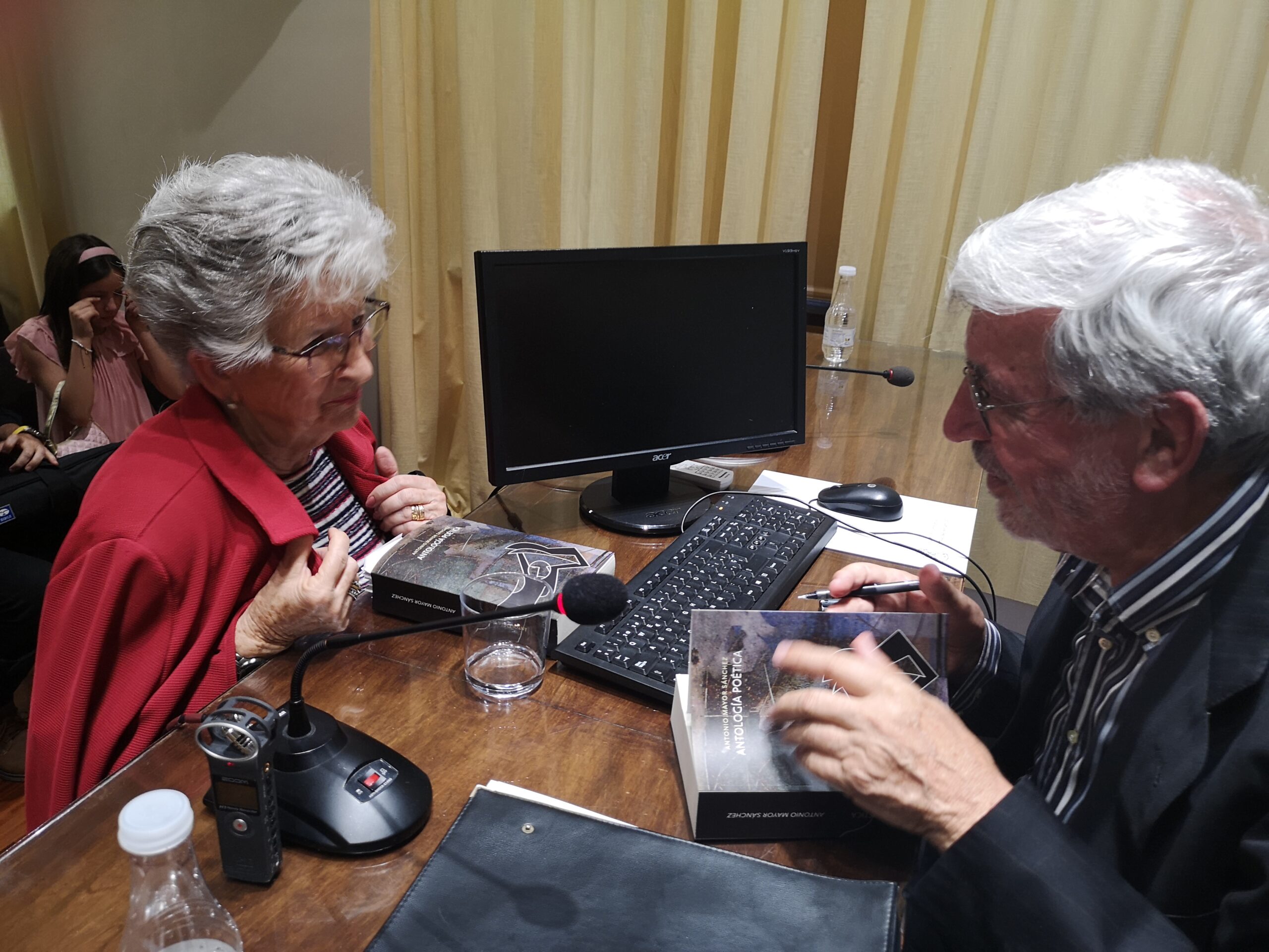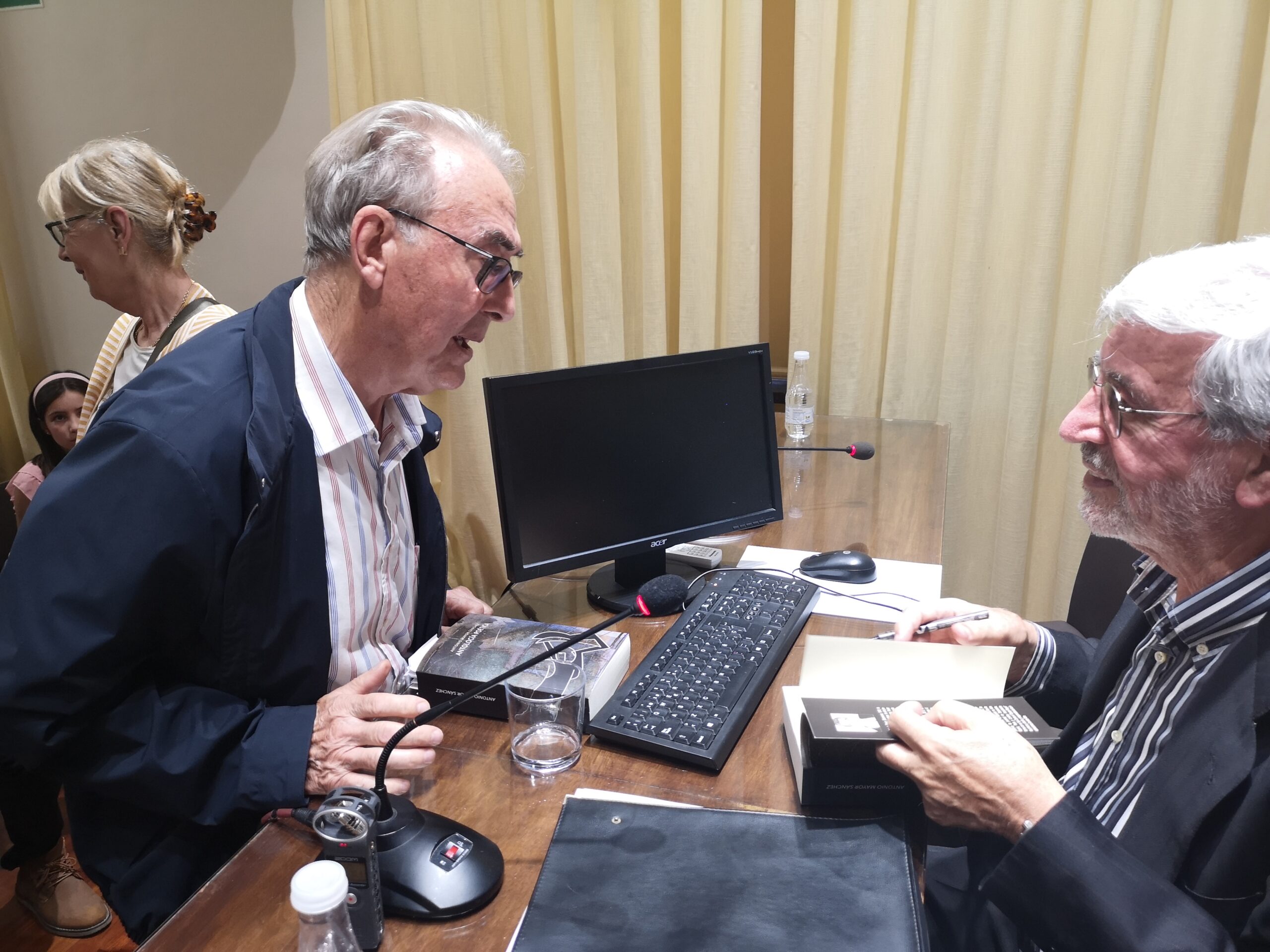Salieron varios poetas a leer alguno de sus poemas entre los que se encontraban, Rosa Llorens, Félix Molina, el poeta valenciano afincado en Madrid, Rafa Soler que recitó por medio de un vídeo que envió, Norma González, Pascual Casañ, y se pasaron algunos videopoemas como el de Virgilio, precioso, que hablaba de montañas azules, otro de José Grimalt y uno del hijo de Antonio con el recitado de su padre, bellísimo. Y no me olvido de los dos poemas que leyeron dos de sus nietas que lo hicieron muy bien, la pequeña, además, nos leyó un segundo poema, escrito por ella, dedicado a su abuelo, parece que seguirá su estela poética, una delicia escucharlas. No dejaré fotografías ni video de ellas porque son menores y hay que tener cuidado con las redes.