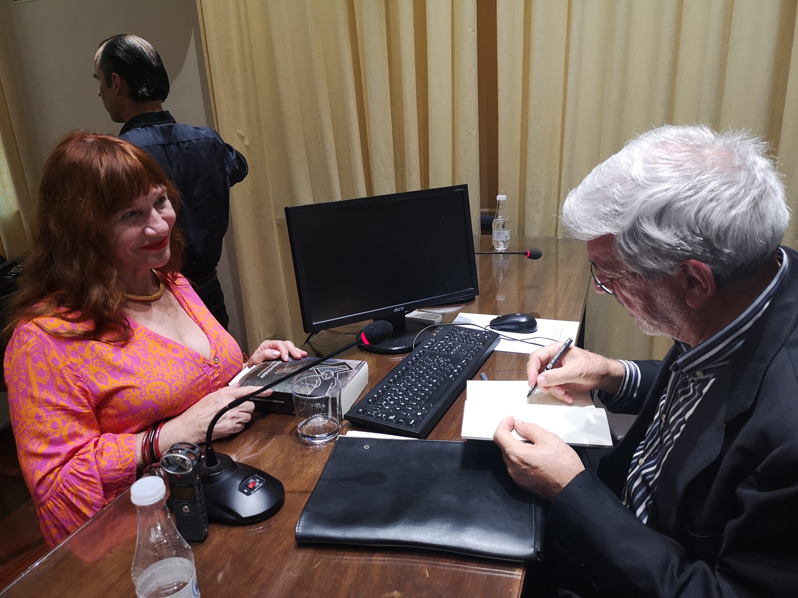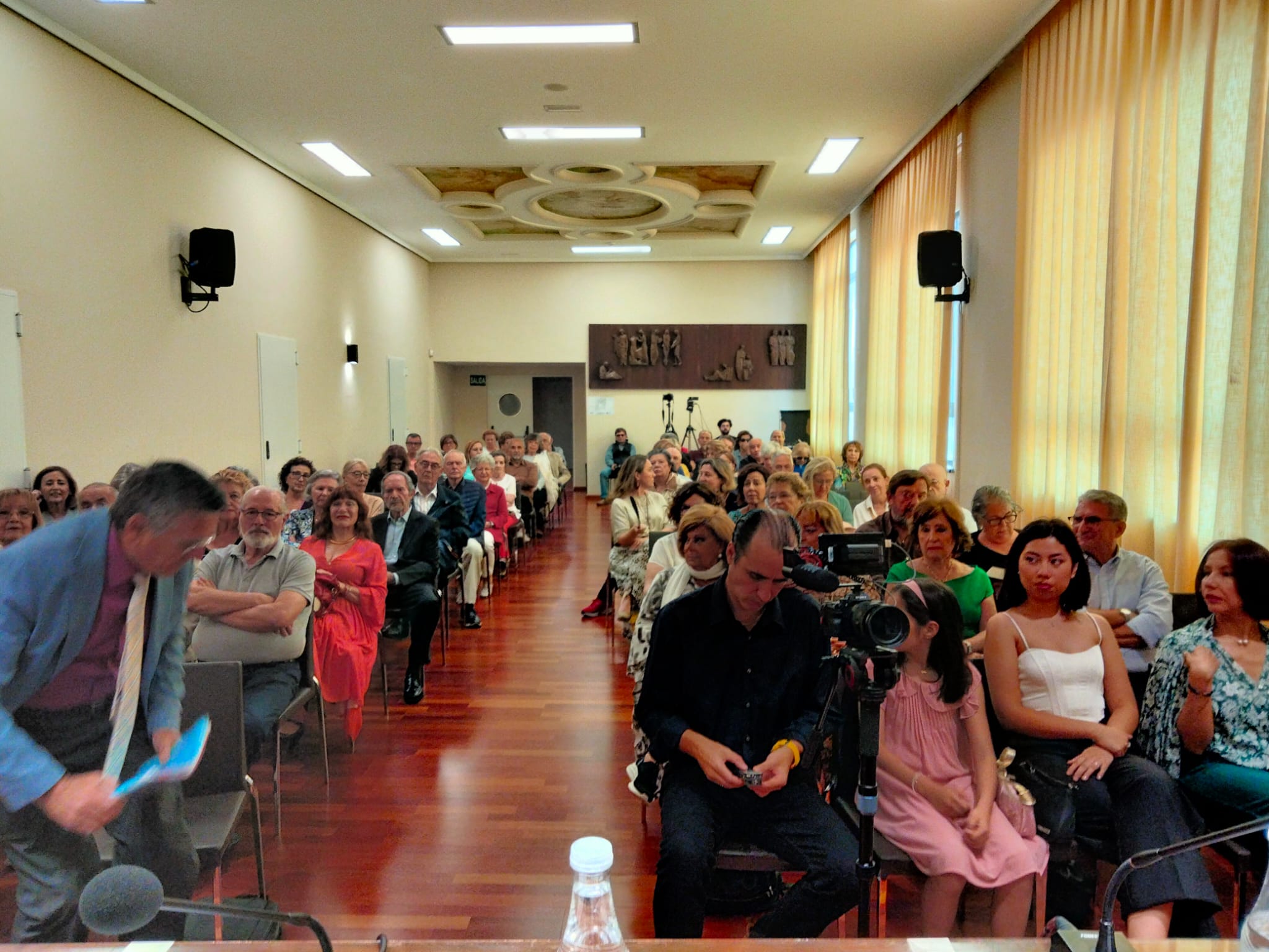 Miré si había alguna silla libre al final de la sala y al primero que vi fue a mi querido amigo y fotógrafo, el mejor, Jose Luis Vila Castañer qué alegría me dio verle. Entre los dos nos repartimos las dos sillas del final y lo arreglamos divinamente. En eso se acerca una chica a saludarme, en el primer momento no caí, pero enseguida la reconocí, era una excompañera del TSJ, una poeta de la que hablaré después, a la que desde el primer confinamiento no había visto, qué alegría me llevé también al verla, qué bien empezaba la tarde.
