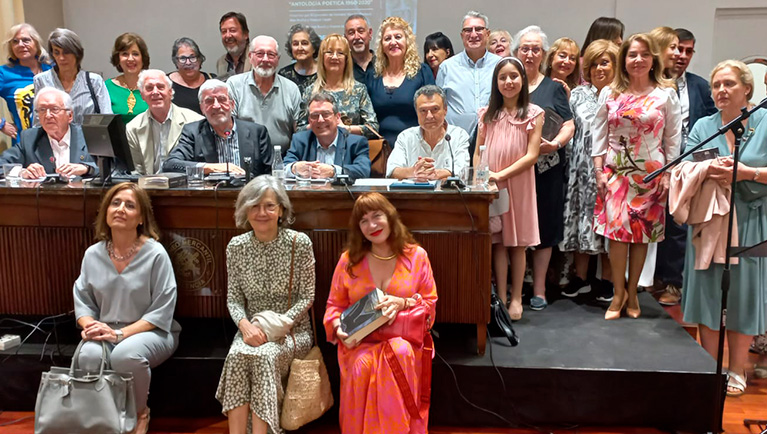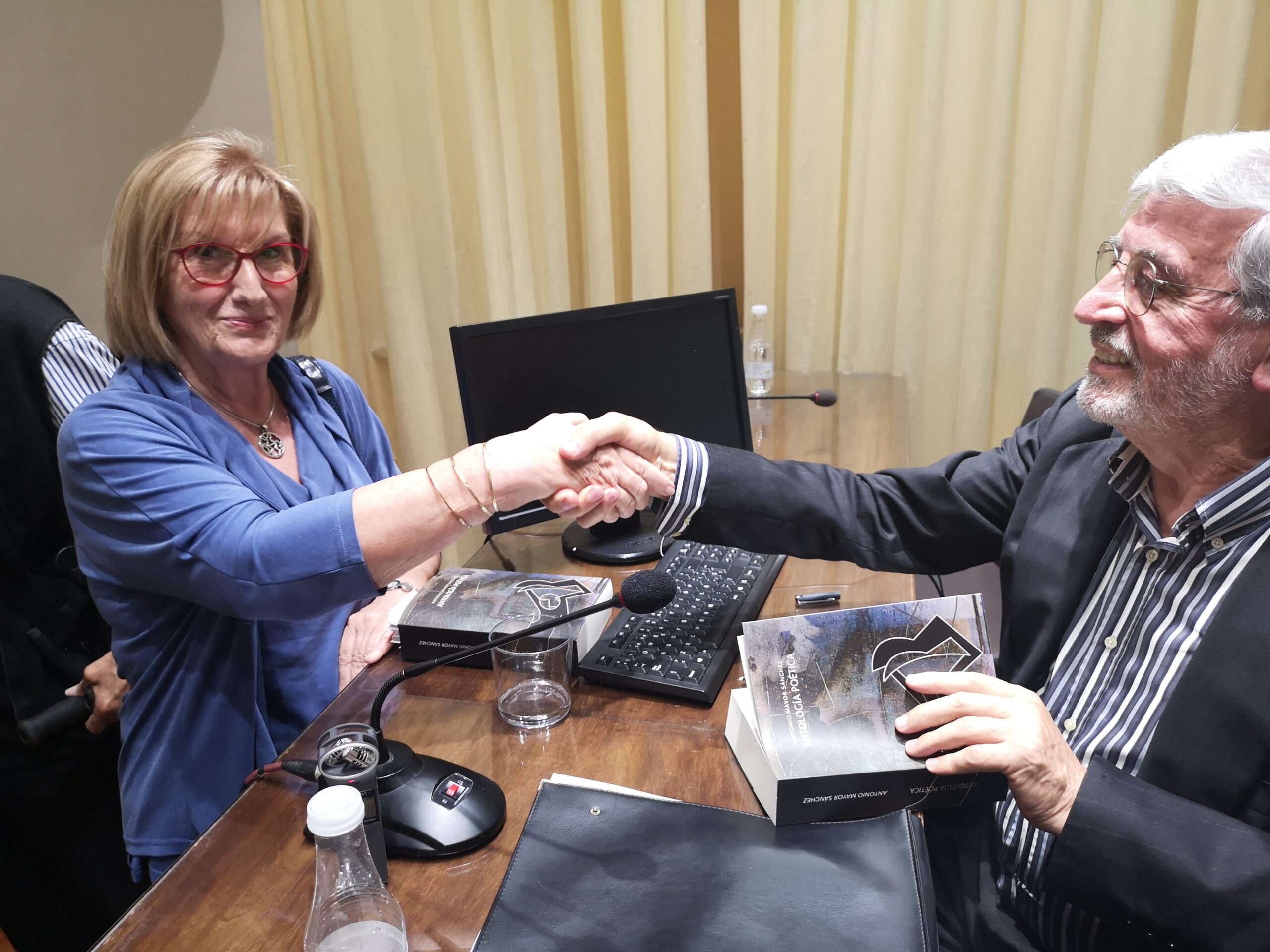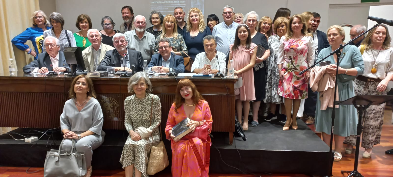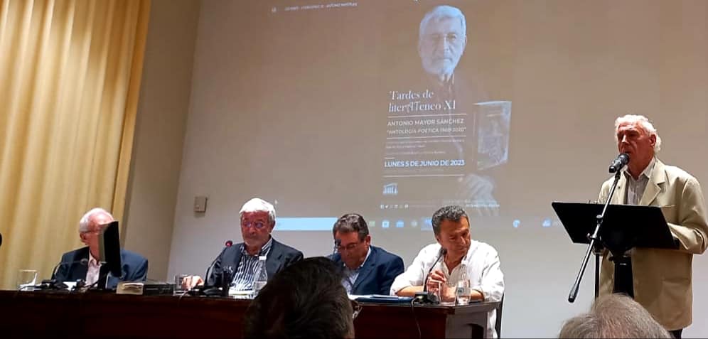 Enseguida subieron a la tarima para sentarse a la mesa con sus dos compañeros, Vicente Barbera Albalat y Pascual Casañ: Antonio Mayor y Blas Muñoz, como decía antes, ya estaban sentados, de esta manera entre los cuatro, miembros del grupo poético El Limonero de Homero se completó la mesa, Antonio, además, era el que presentaba su nuevo libro: Antología Poética 1960-2020, ese era el motivo por el que estábamos esa tarde todos allí.