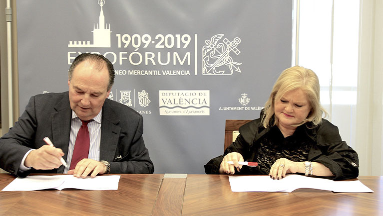 La presidenta de la Fundación Ateneo Mercantil de Valencia Carmen de Rosa Torner y el presidente de Cámara Valencia José Vicente Morata han firmado un acuerdo entre ambas instituciones que tiene como objetivo colaborar en la conmemoración del 110 aniversario de la Exposición Regional de Valencia impulsando el evento Expoforum 2019, que incluirá una serie de actividades relacionadas con la cultura y la economía con el objetivo de recuperar el espíritu pionero e innovador de la Exposición.