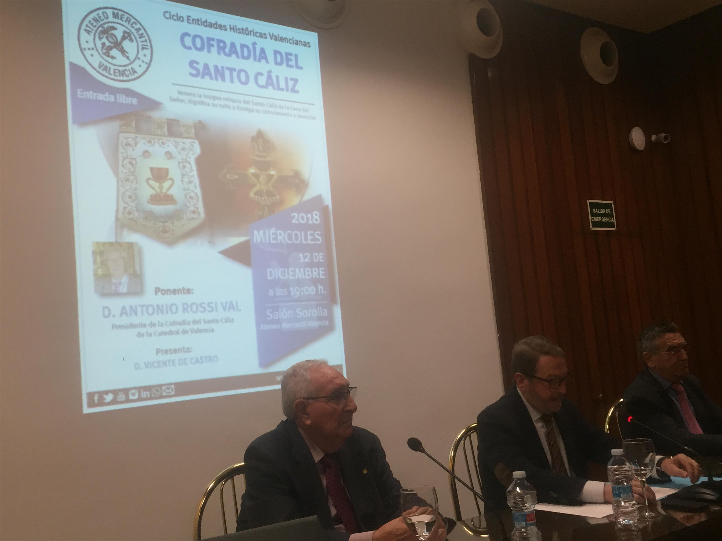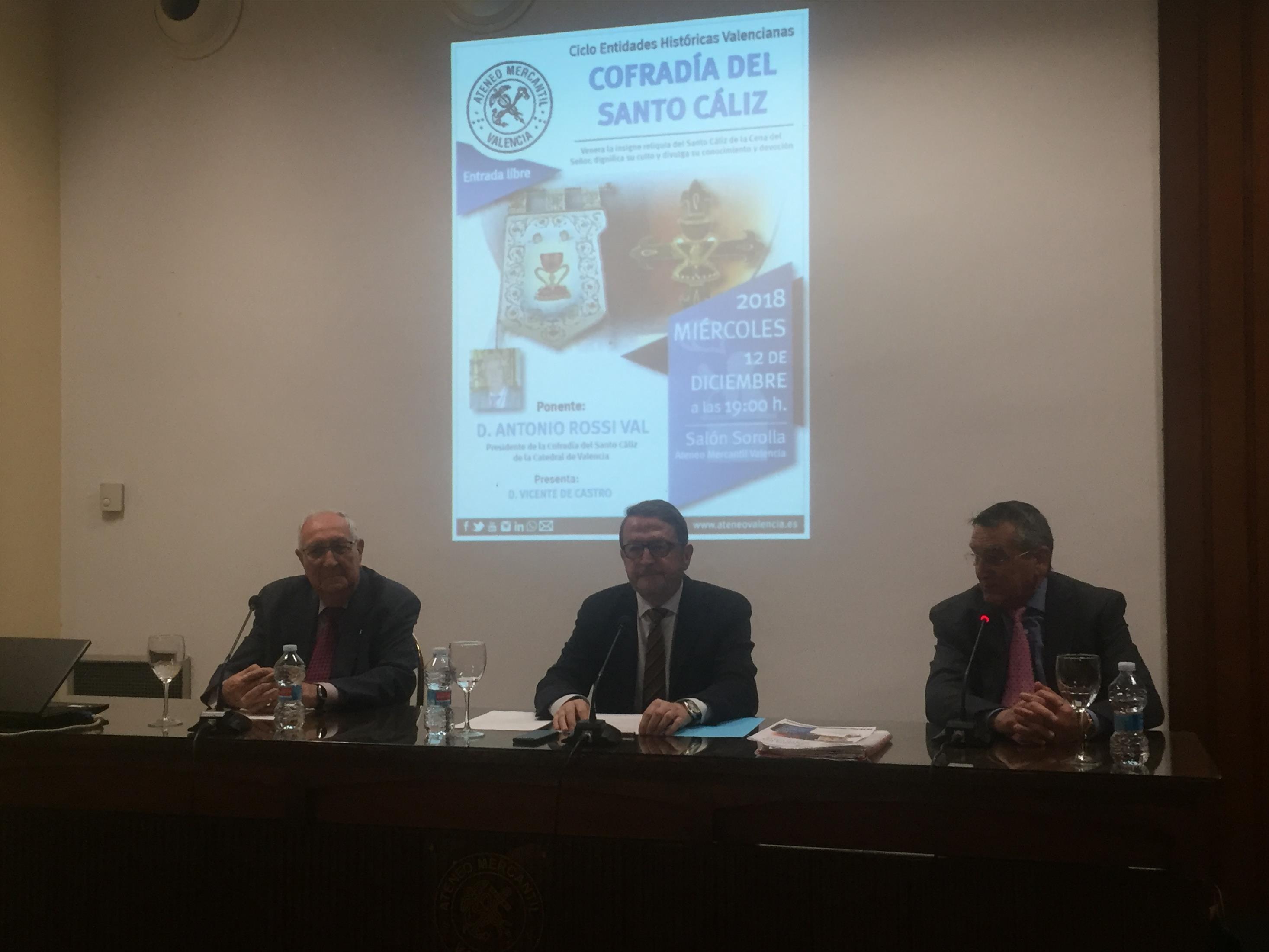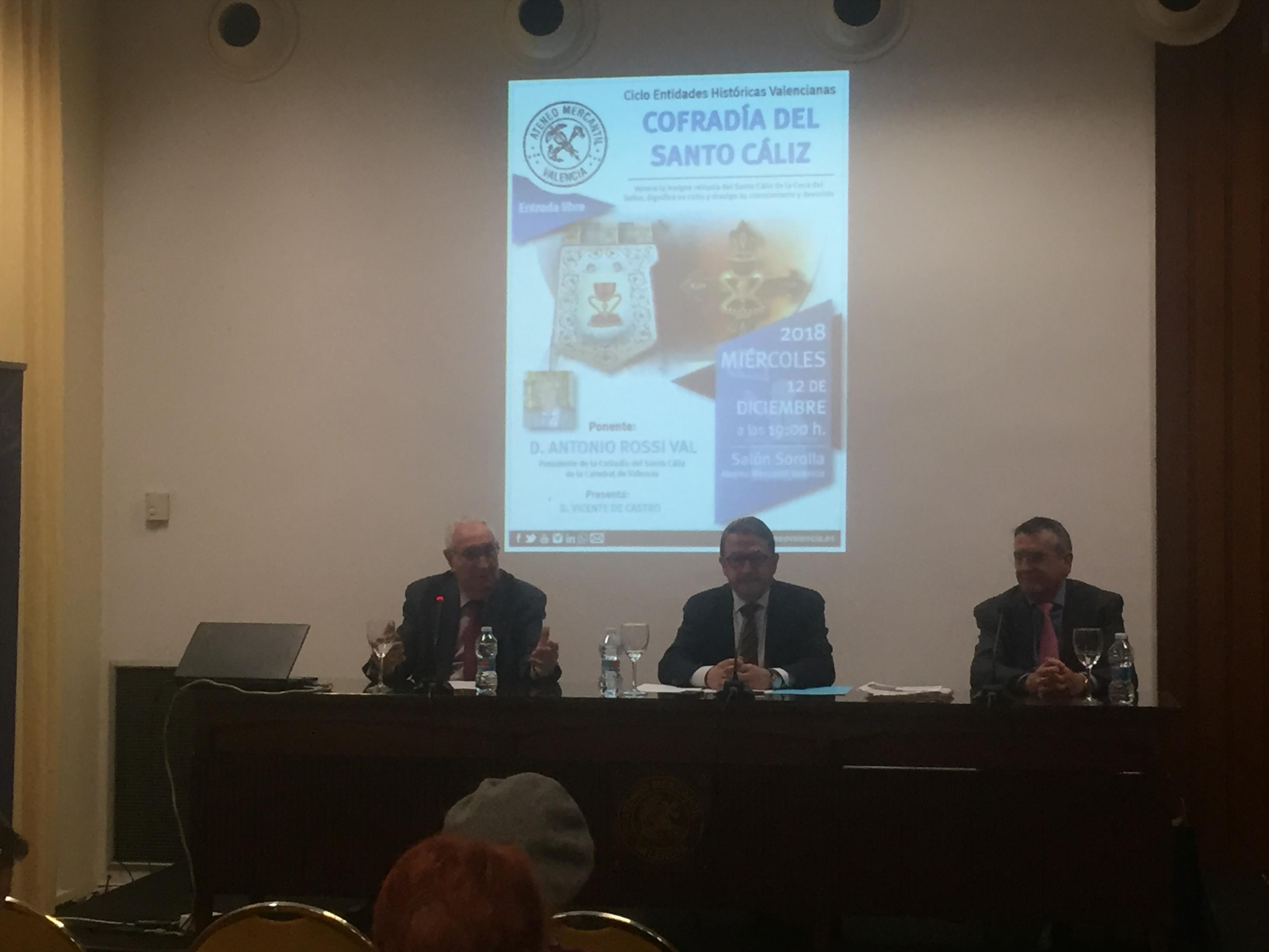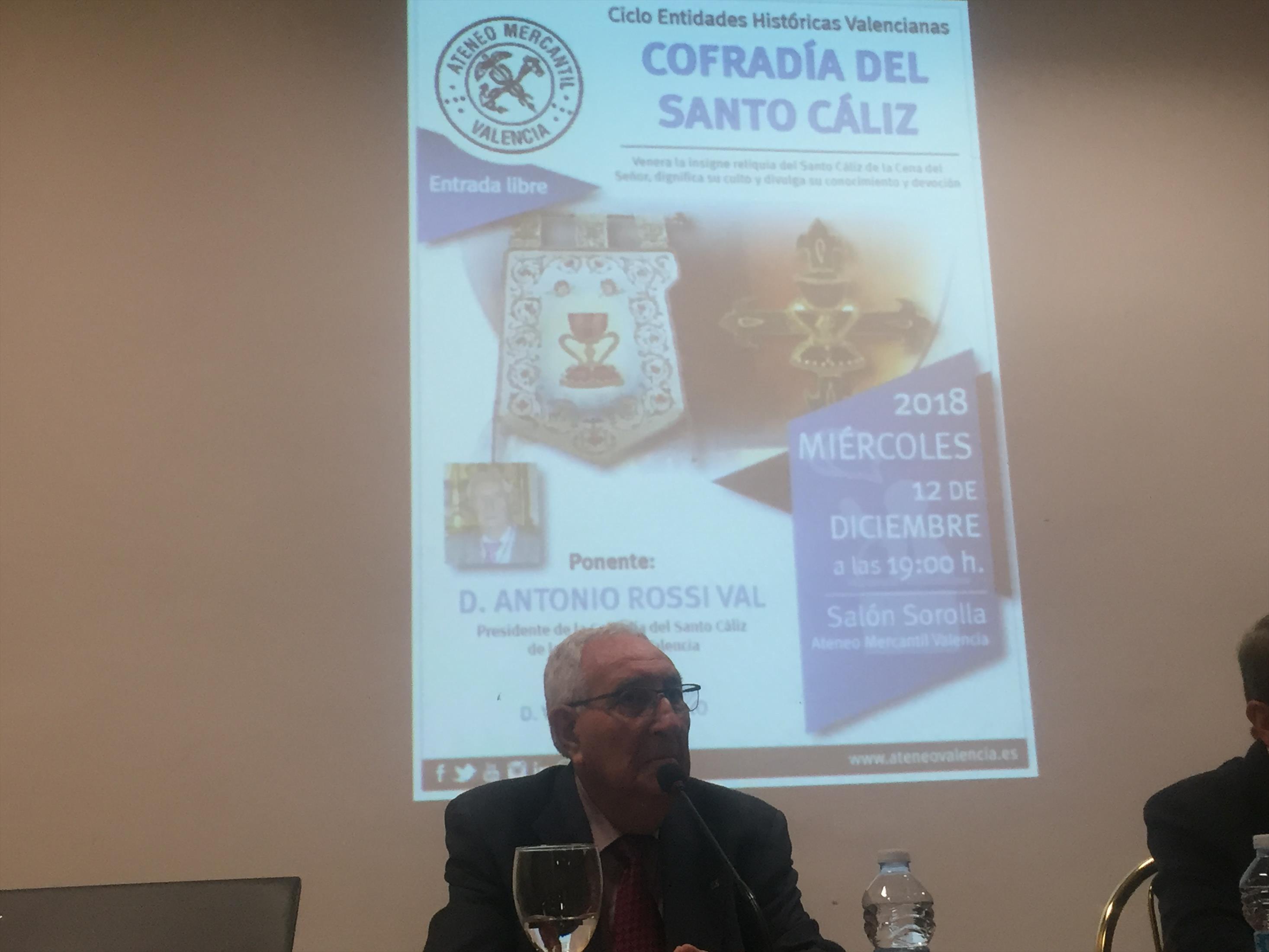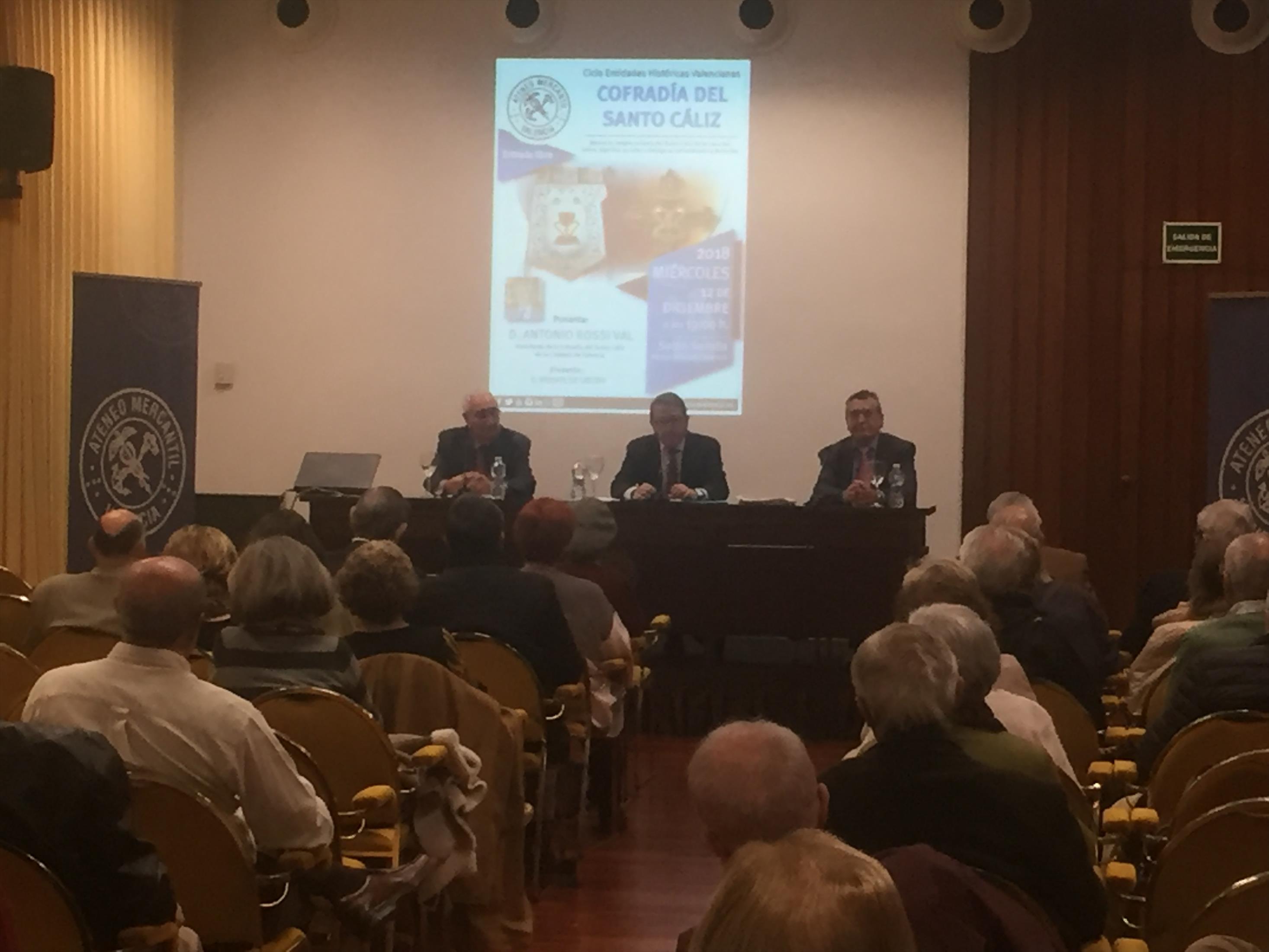 El Ciclo de Entidades Históricas se despidió de este 2018 con una conferencia que trató sobre la historia de la Cofradía del Santo Cáliz de Valencia que venera la reliquia más buscada y protegida del cristianismo como es el Caliz que se utilizó en la Última Cena. La conferencia la impartió el presidente de la Cofradía del Santo Cáliz, D. Antonio Rossi Val.