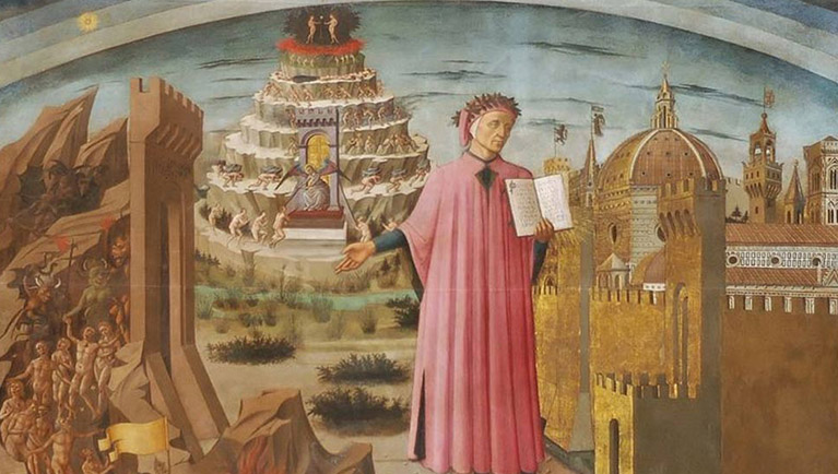 El esquema del universo dantesco es una elaborada mezcla de matemáticas y doctrina cristiana; para él, el universo consta de materia y forma, el Infierno tiene la figura de un cono invertido, que se estrecha a través de nueve círculos concéntricos hasta el centro de la Tierra, donde vive Lucifer.