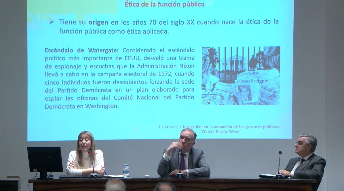Los preceptos y valores éticos está recogidos en las normativas, en la Constitución, por ejemplo; o en el estatuto del empleado público. En el ámbito público, la ética se refiere a la integración de los valores en los gestores públicos. Y tiene su desarrollo en los años 70 del siglo pasado. Estos gestores públicos han de cumplir una serie de valores, que no siempre están escritos: hay que potenciar y apelar a esos valores éticos. Las actitudes de estos gestores han de estar dirigidas al benefici0o común. La ética de la función pública es aplicada. A todos nos suena el escándalo de Watergate, como uno de los más importantes y que supuso un punto de inflexión.
