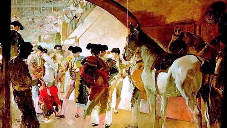 - El atractivo diseño de la cartelería con un toro y toreros sobre el sombrero de Sorolla.
