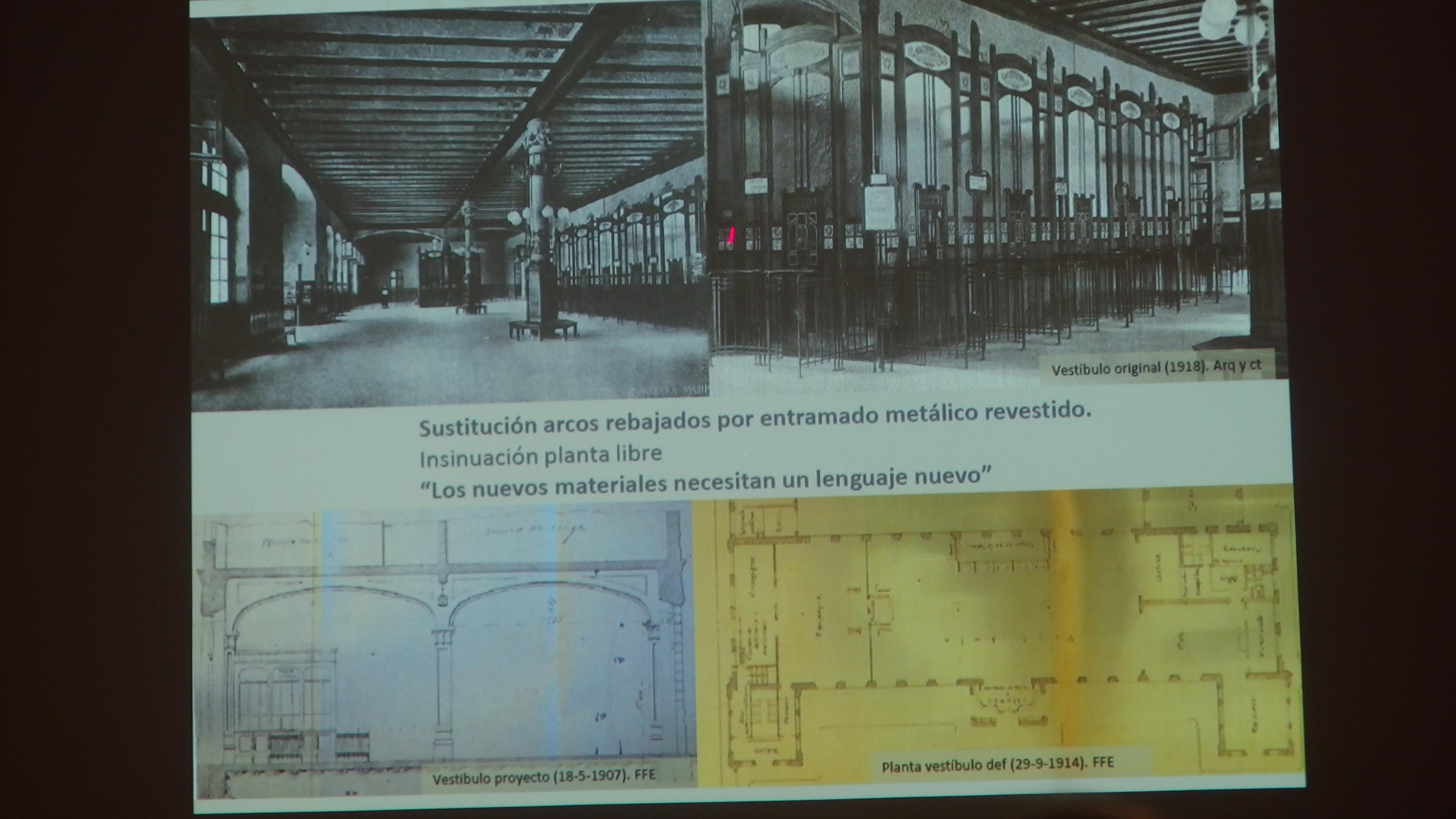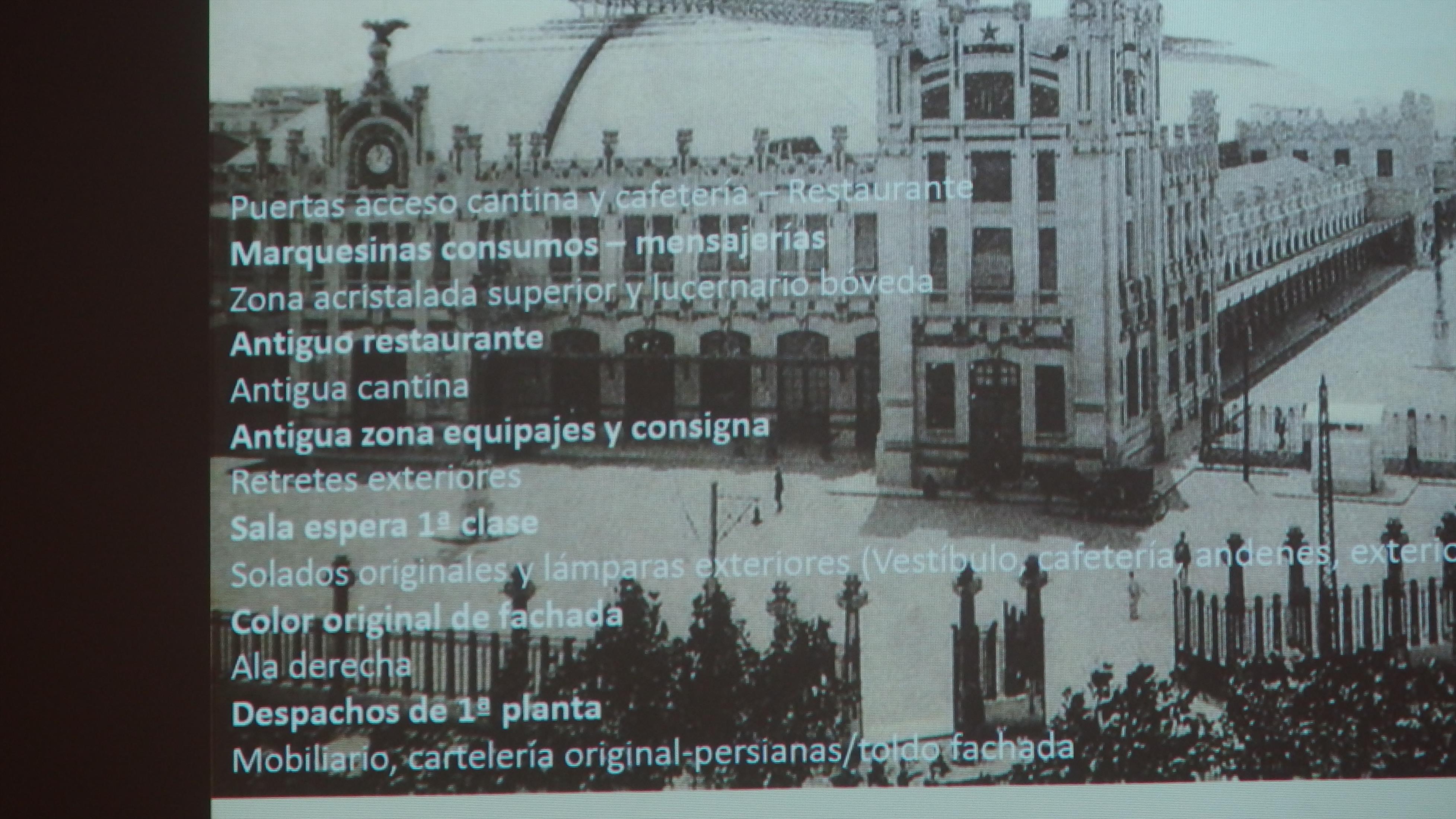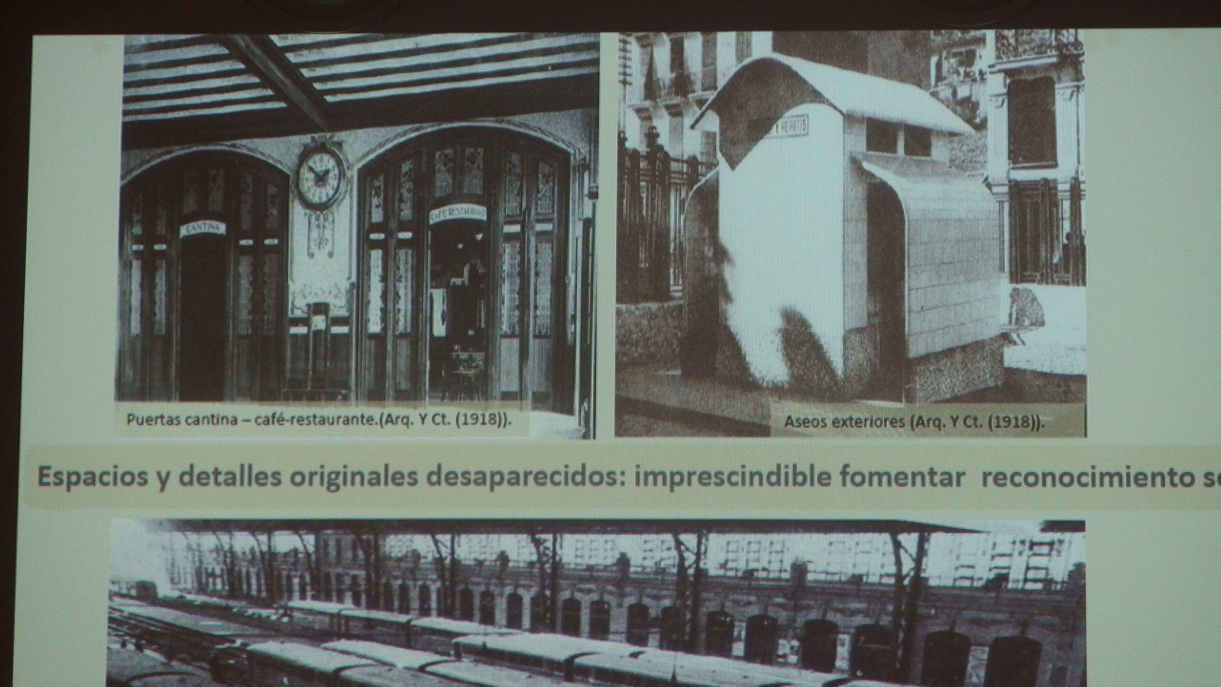La conferencia de la Dra. Dña. Aurora Martínez Corral pretendió mostrar el proceso constructivo de la estación desde el proyecto hasta aquellos detalles originales que todavía quedan en el edificio de viajeros con mención de las pérdidas más relevantes que ha sufrido. Sin olvidar su valor inmaterial: la estación además de lo tectónico, también es receptáculo de la memoria. Fue testigo de numerosos acontecimientos históricos así como de otros valores inmateriales como la memoria del trabajo cuya preservación va asociada a la pervivencia de la pátina del edificio. Por último, el objetivo que se pretende es poner un granito de arena en la necesaria concienciación y estima por parte de los usuarios lo cual es garantía de preservación.