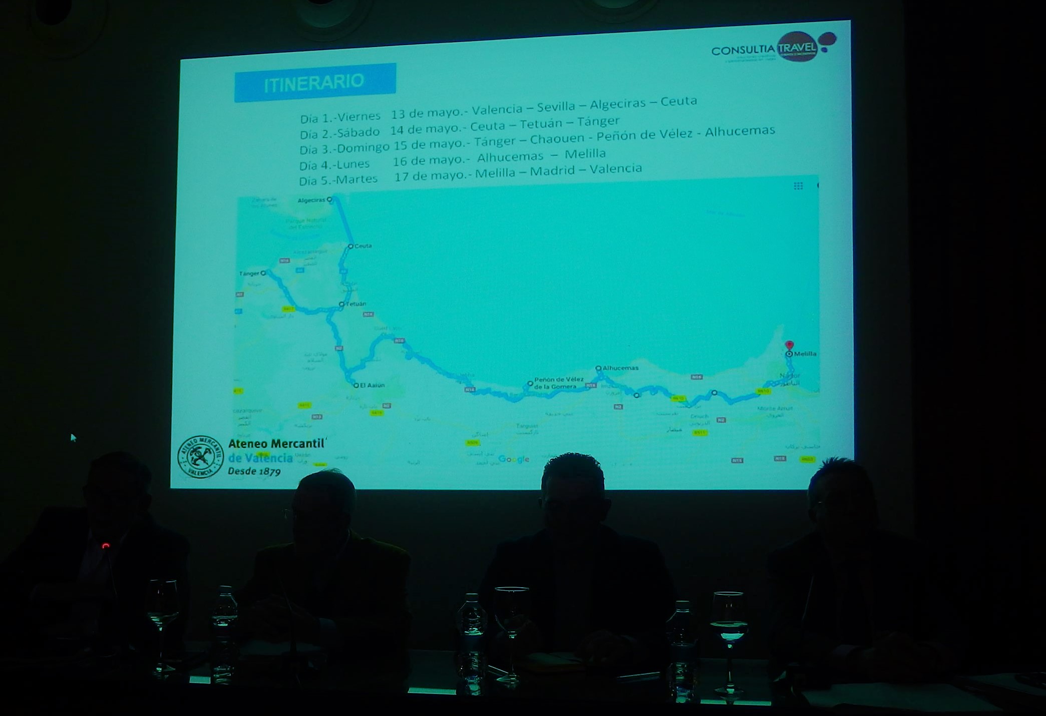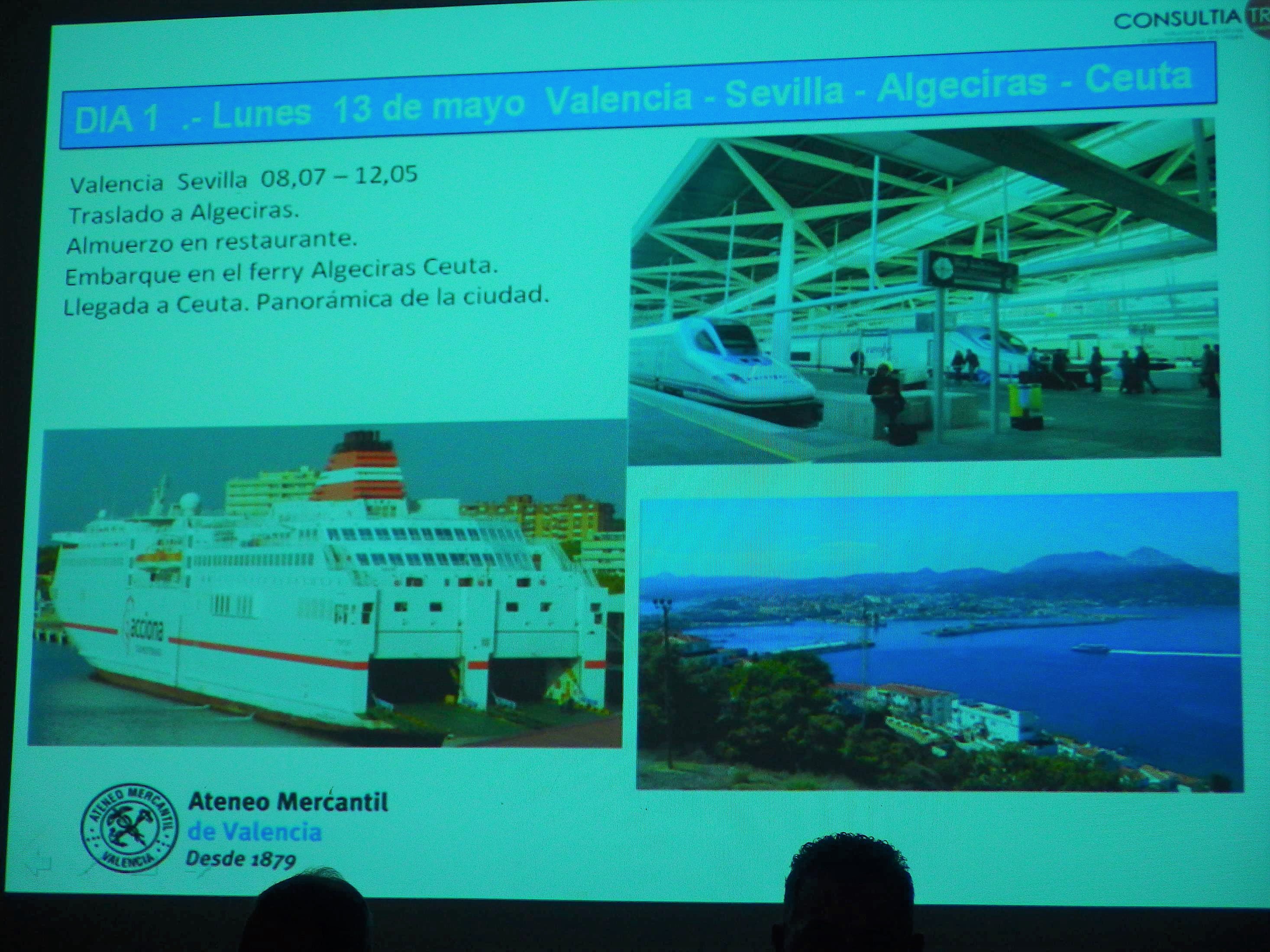 El Salón Sorolla se llenó para escuchar la información que la Agencia de Viajes Consultia Travel dio a nuestros socios sobre el viaje a Ceuta y Melilla que se llevará a cabo a mediados del mes de mayo. A las 19 horas ya no cabía ni un 'alfiler' en el salón y comenzó la presentación oficial de un viaje que va a ser una experiencia única, ya que se visitarán varias de las posesiones españolas en el continente africano, las ciudades autónomas de Ceuta y Melilla, así como varias islas e islotes reconocidas como plazas soberanas como las Islas Alhucemas y el Peñón de Vélez de la Gomera. Este viernes se podrá empezar a abonar un viaje que reservaron casi un centenar de personas, por lo que ya se trabaja en confeccionar dos grupos.