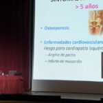 9.- La osteoporosis es un trastorno del hueso: se hace menos denso y más frágil. Afecta rápidamente a las mujeres al perder los estrógenos. Es una enfermedad de los huesos que se vuelven más frágiles. Se producen fracturas con traumatismos mínimos o incluso sin traumatismo perceptible. Afecta al 50% de las mujeres mayores de 70 años. Es silenciosa. Afecta fundamentalmente a la parte distal de columna, a la cabeza de fémur y a los huesos de la muñeca. La prevención es fundamental. A fecha de hoy, se puede obtener una efectividad del 70% de evitación de pérdida de masa ósea. Hay dos factores de riesgo exclusivos de las mujeres: menopausia precoz; y cualquier situación de pérdida de estrógenos. Hay escalas clínicas de riesgo que el médico puede aplicar para comprobar si vale la pena un tratamiento concreto. La dieta es fundamental: calcio y vitamina D. Pero también es importante el ejercicio correspondiente a la edad: 15 minutos al día, 365 días al año; y ayuda mucho. Hay que intentar evitar las caídas: zapatos cómodos, bastones, y lentes de corrección graduadas. Y cuidar la dieta: comer mucho de poco y nada de mucho. Y es bueno que la menopausia sea compartida, en el ámbito familiar (marido), social, etc.