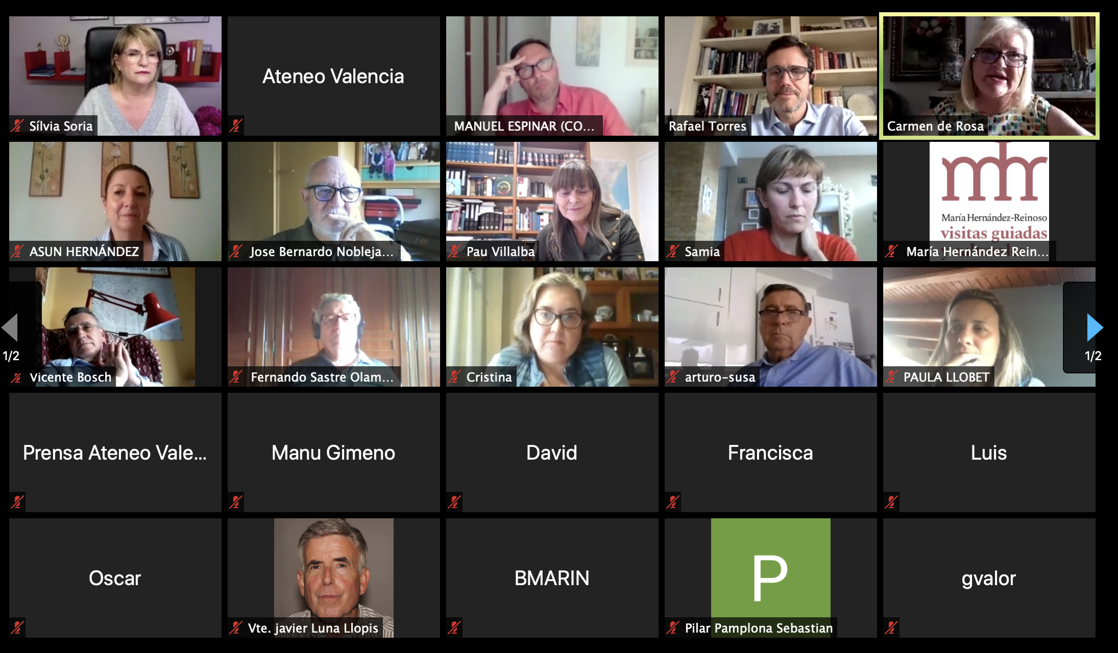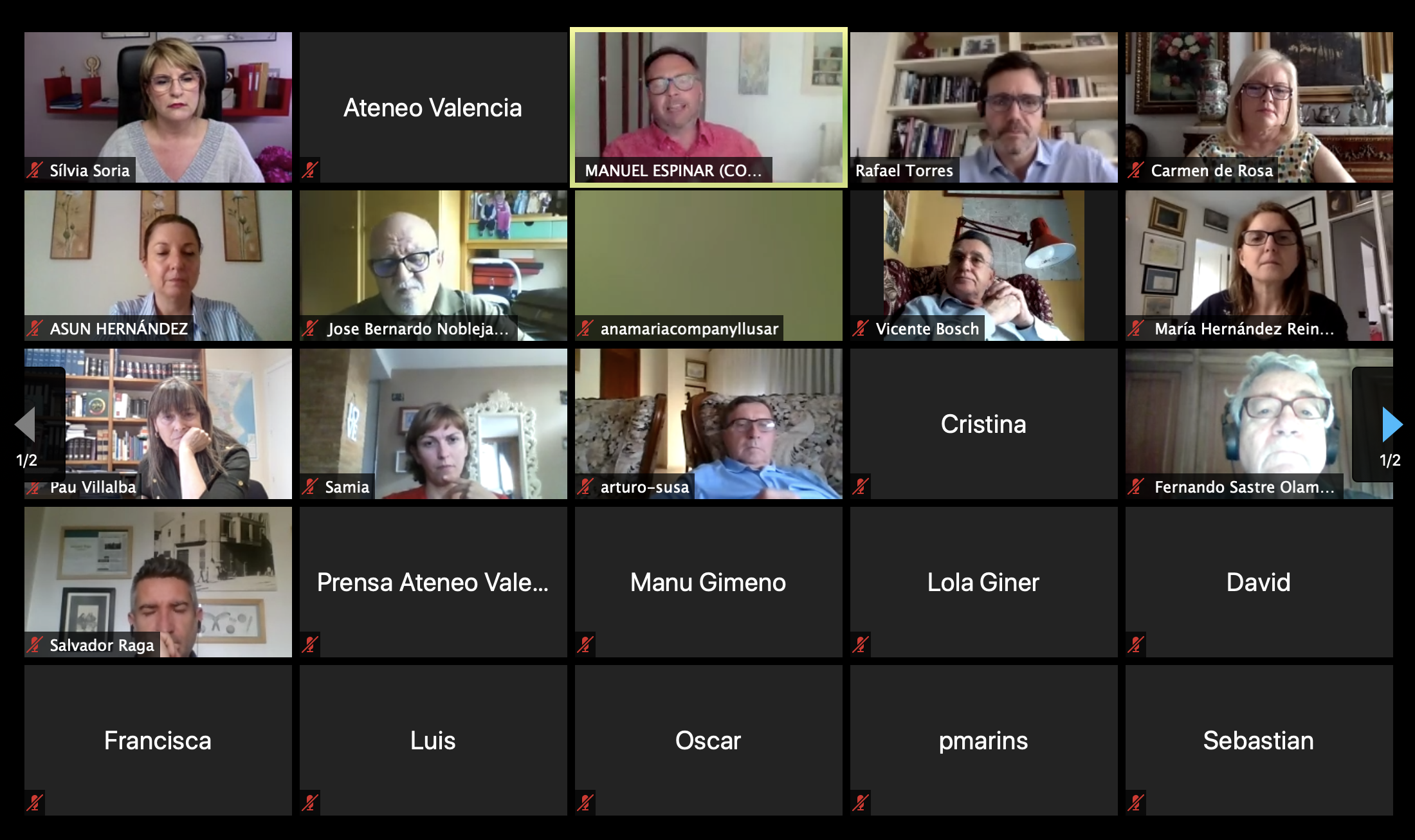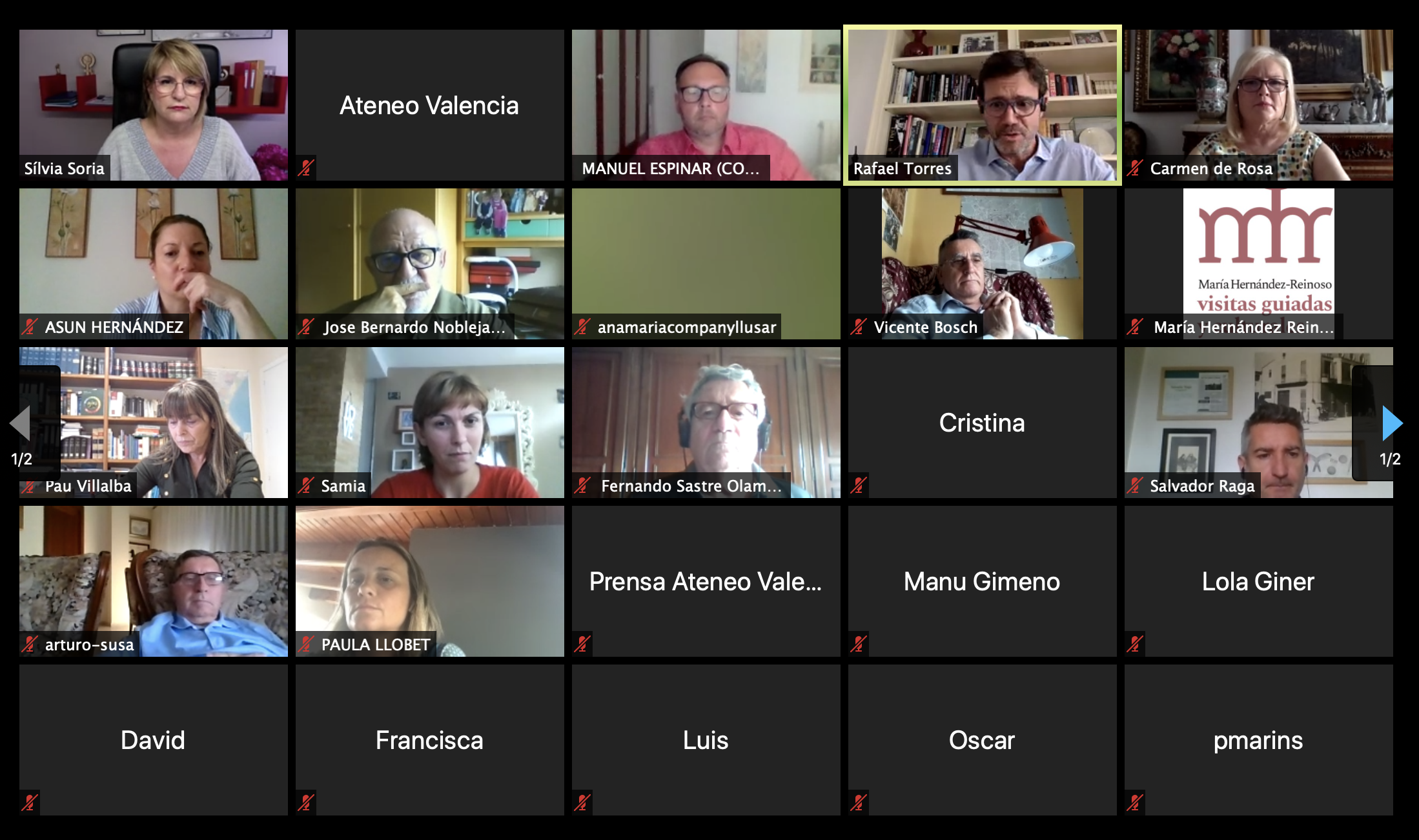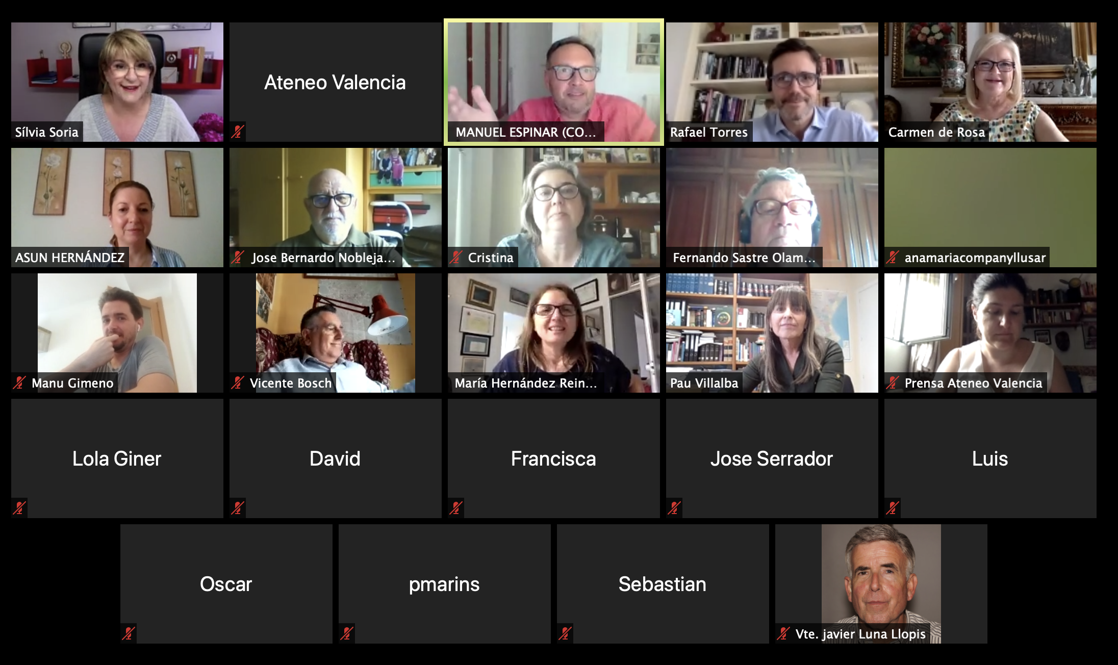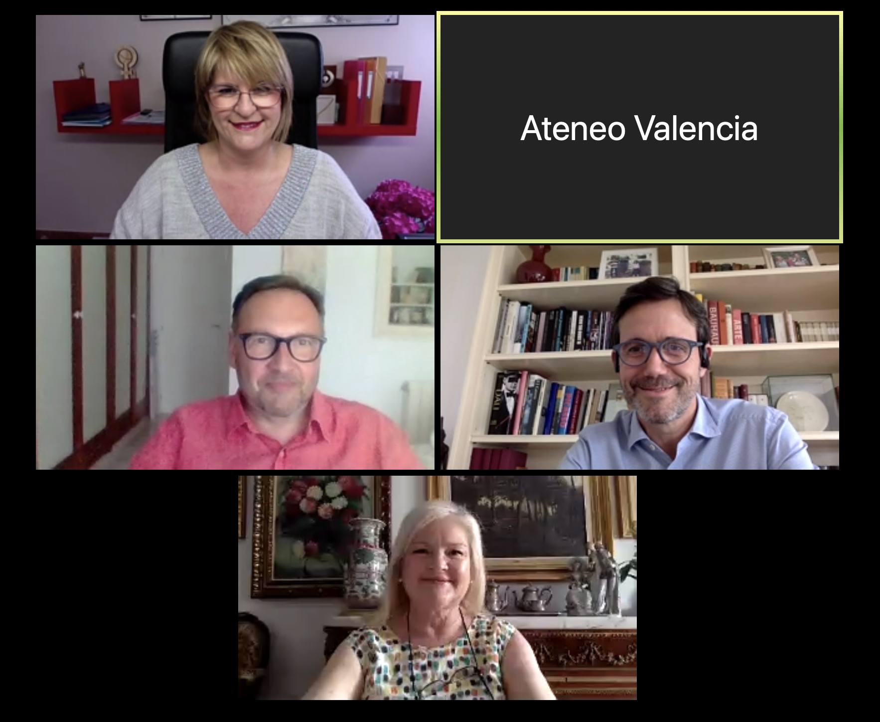 La webinar del Ateneo Mercantil "El futuro del comercio y de la hostelería" contó con la intervención de Rafael Torres, presidente de Confecomerç y Manuel Espinar, representante de la Federación de Empresarios de la Hostelería de Valencia. La mesa redonda estuvo moderada por la periodista Silvia Soria y presentada por Carmen de Rosa, presidenta del Ateneo Mercantil.