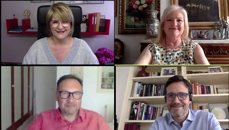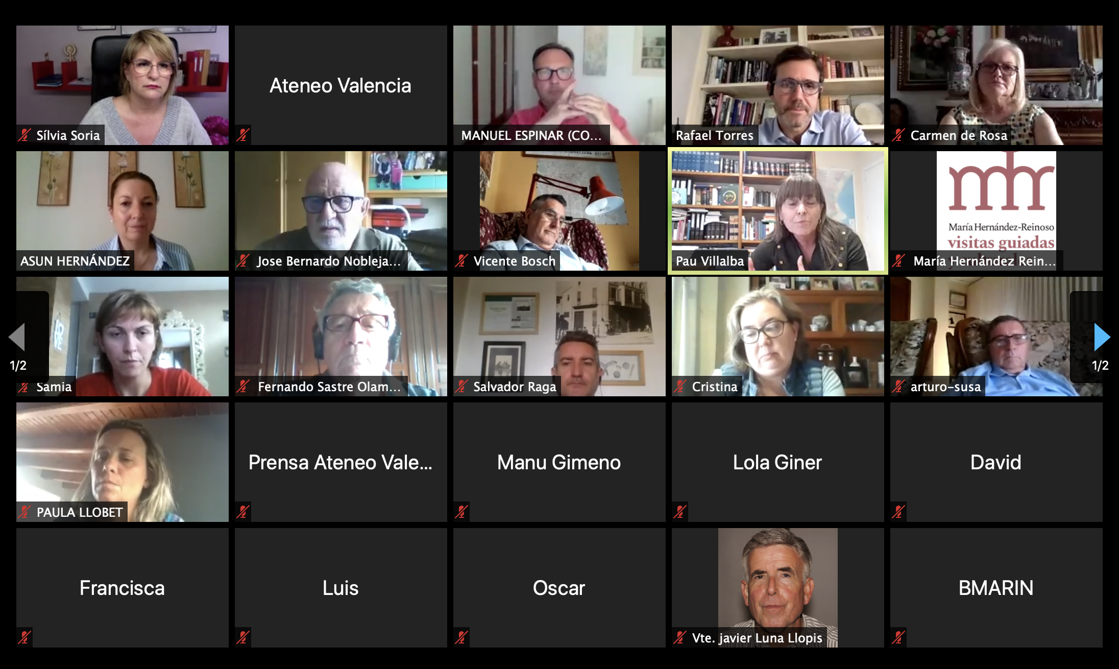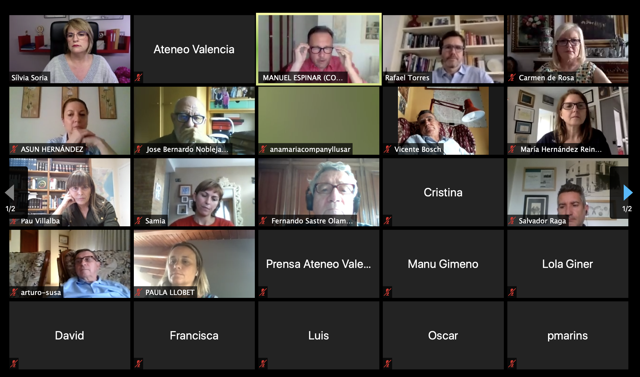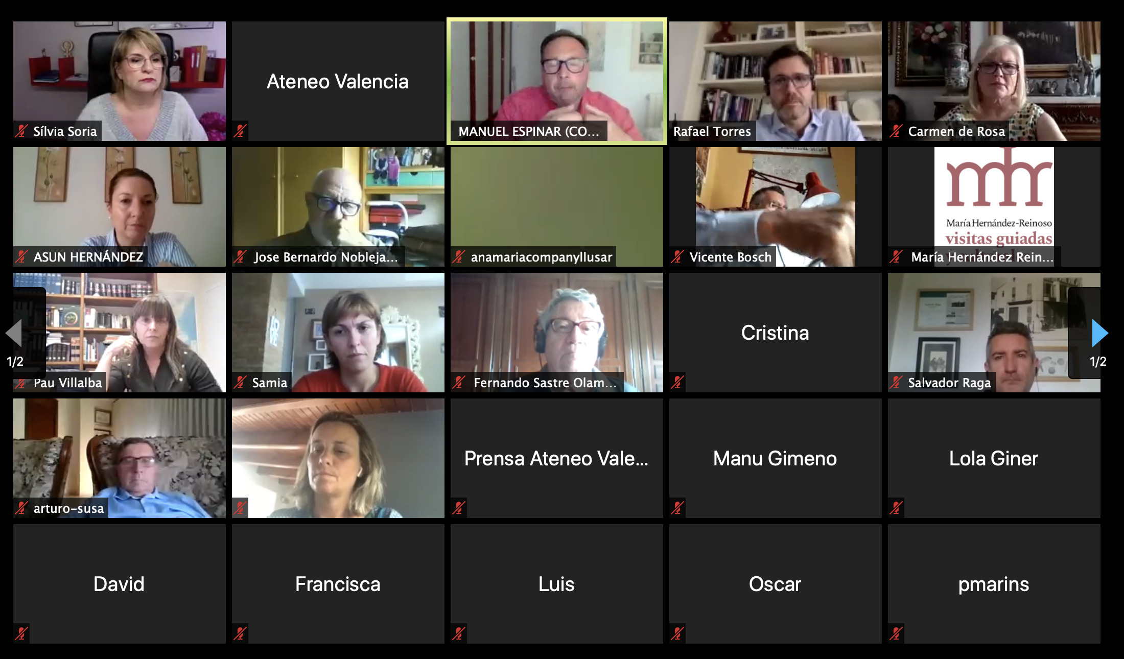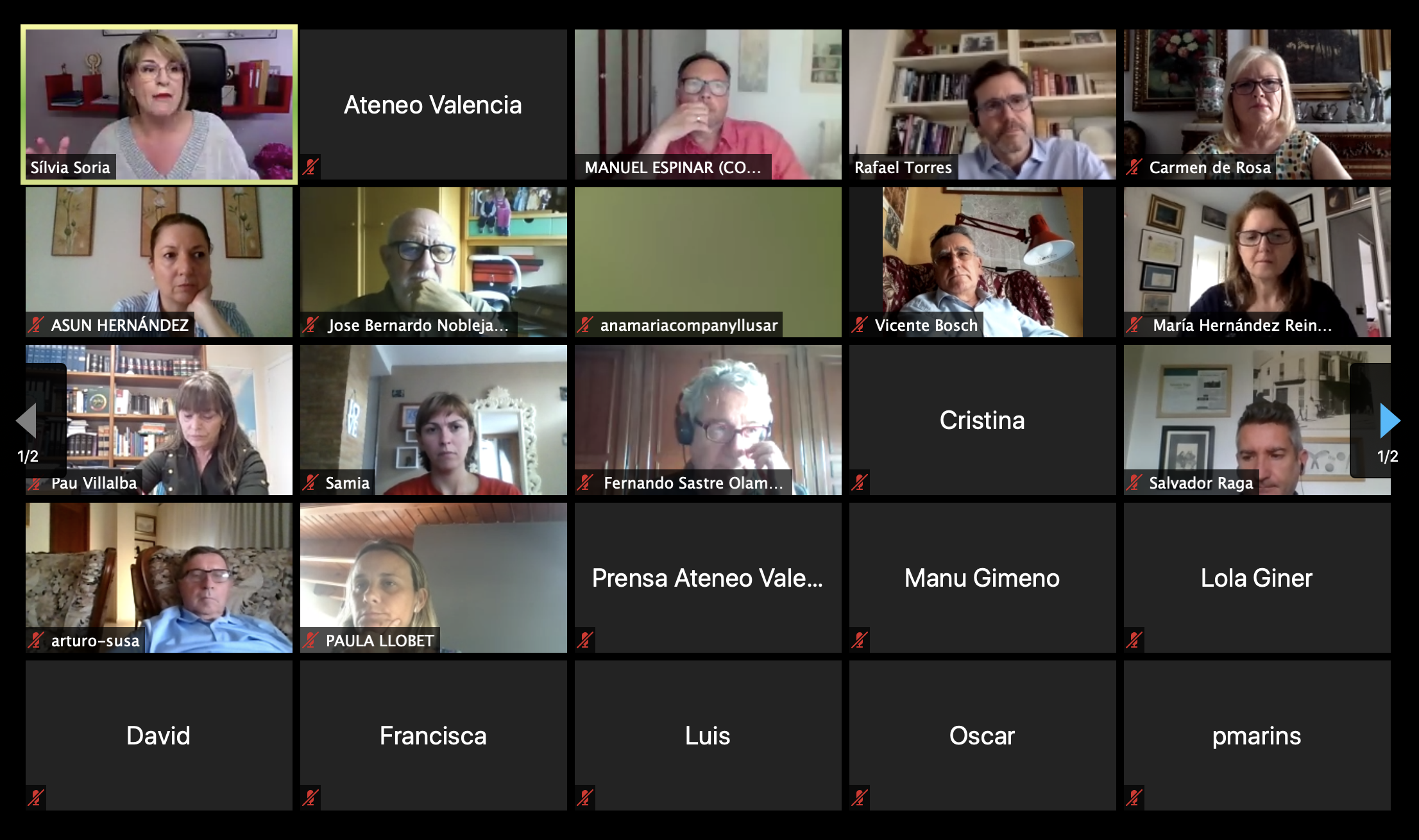 La webinar del Ateneo Mercantil "El futuro del comercio y de la hostelería" contó con la intervención de Rafael Torres, presidente de Confecomerç y Manuel Espinar, representante de la Federación de Empresarios de la Hostelería de Valencia. La mesa redonda estuvo moderada por la periodista Silvia Soria y presentada por Carmen de Rosa, presidenta del Ateneo Mercantil.