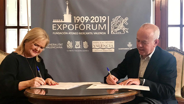 La presidenta de la Fundación Ateneo Mercantil de Valencia, Carmen de Rosa y el presidente la Federación de Tenis de la Comunidad Valenciana, Antonio Martínez Cascales, han firmado un convenio de colaboración en el marco de las celebraciones de Expofórum 2019 Valencia, que conmemoran los 110 años de la Exposición Regional de 1909 que se celebró en Valencia y que pretenden poner en valor una ciudad moderna, con unas señas de identidad propias como son la cultura del esfuerzo, la innovación, el conocimiento, la investigación, el emprendimiento o la sostenibilidad.