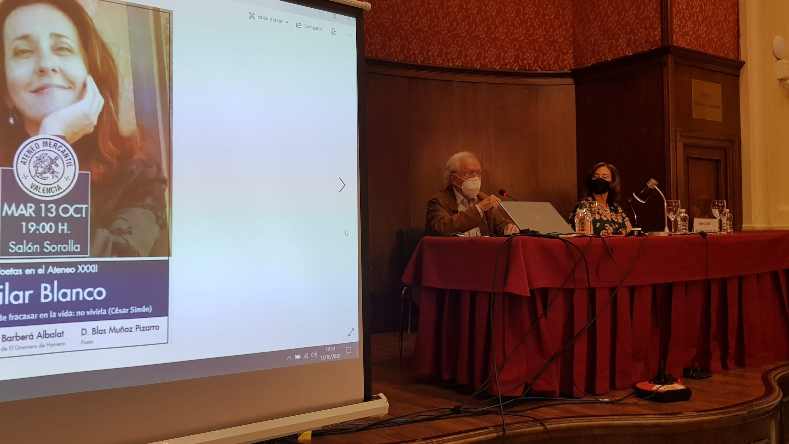 Pilar Blanco fue la siguiente poeta por desfilar por el Ateneo Mercantil. Profesora de Lengua y Literatura, poeta con mayúsculas, inventora de lenguaje, Pilar Blanco es autora de un buen número de poemarios, entre ellos 'La luz herida', 'Raíces de sangre' o la antología 'Con la cal en los dedos'. Y ha logrado sustanciosos galardones. Como el Francisco de Quevedo por 'Vocabulario íntimo', el Miguel Hernández por 'Ceniza' o el San Juan de la Cruz por 'El jardín invisible'.