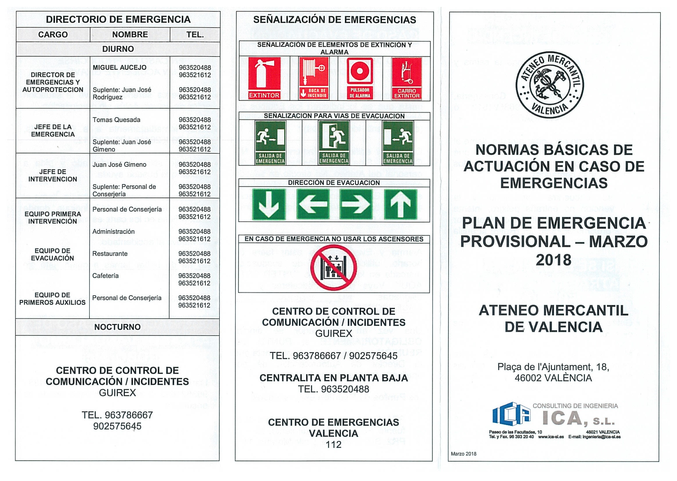 La Ley de Prevención de Riesgos Laborales indica en su artículo 20 la necesidad de disponer un Plan de Emergencias en todas las empresas, también en el Ateneo Mercantil, para así adoptar las medidas necesarias en materia de primeros auxilios, lucha contra incendios y evacuación del edificio de los socios y los trabajadores.