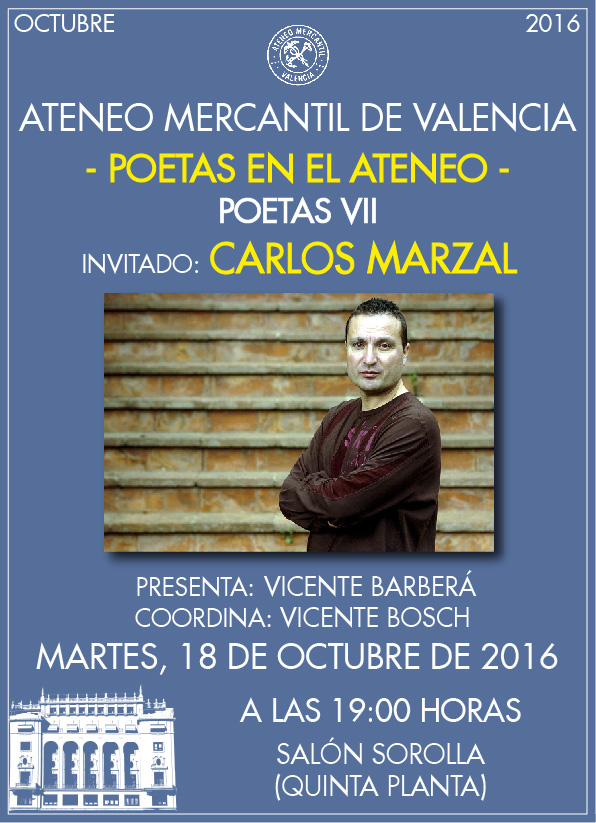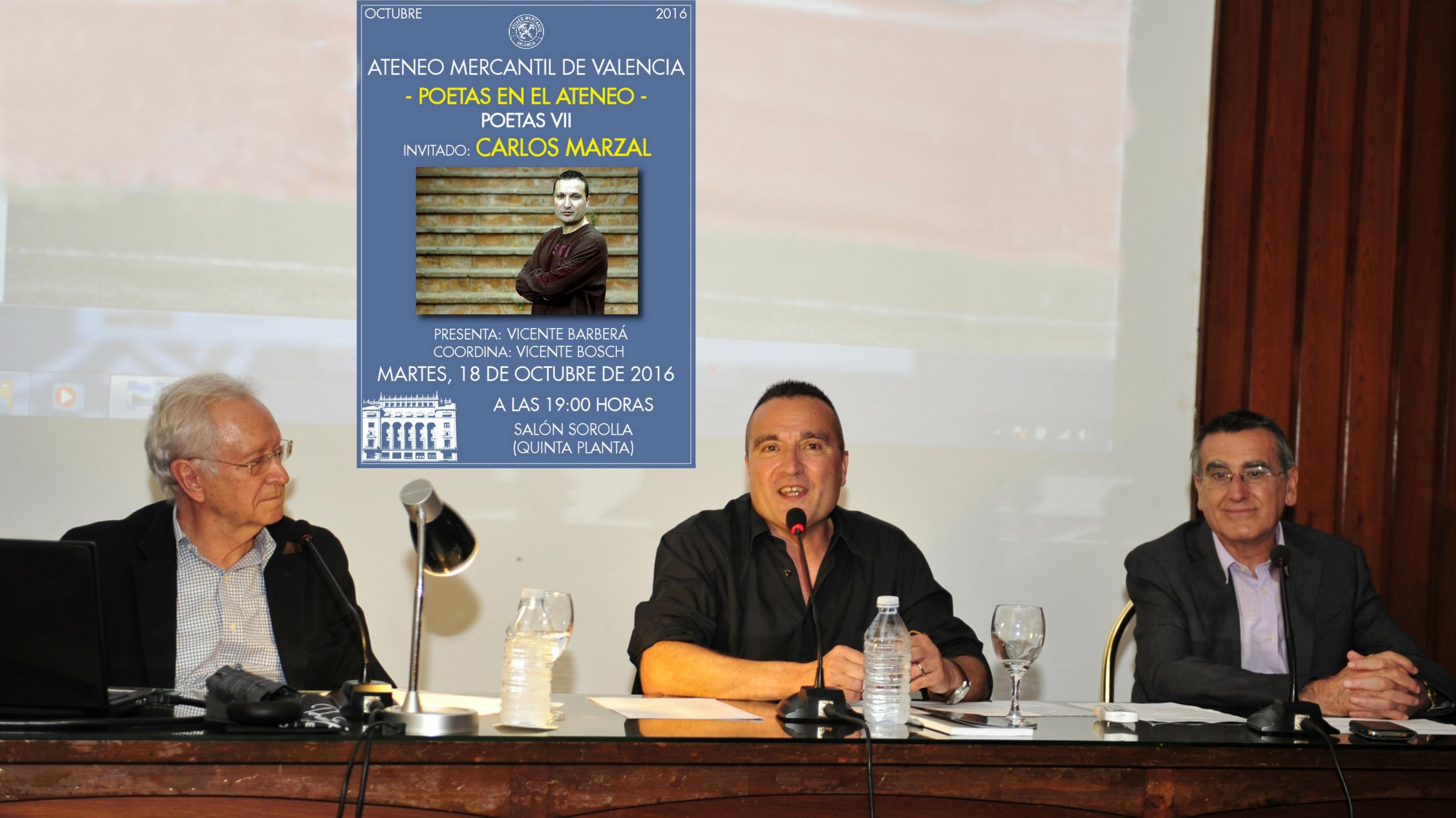 El martes 18 de octubre, a las 19 horas y en el Salón Sorolla del Ateneo Mercantil de Valencia como en ocasiones anteriores, se inició, tras el descanso estival, el curso 2016-17 del Proyecto "Poetas en el Ateneo", dedicado esta vez a uno de nuestros más reconocidos poetas valencianos, Carlos Marzal.