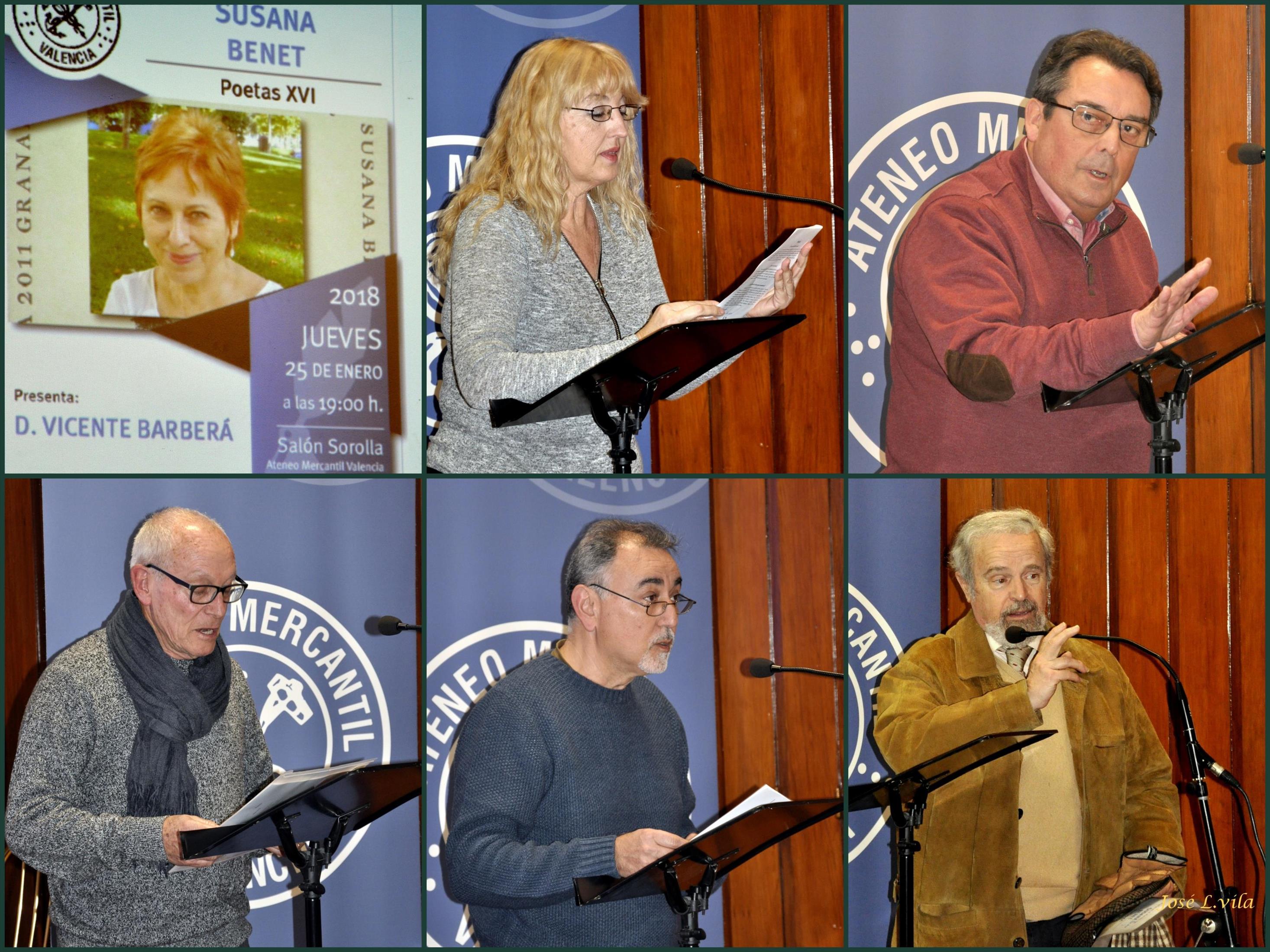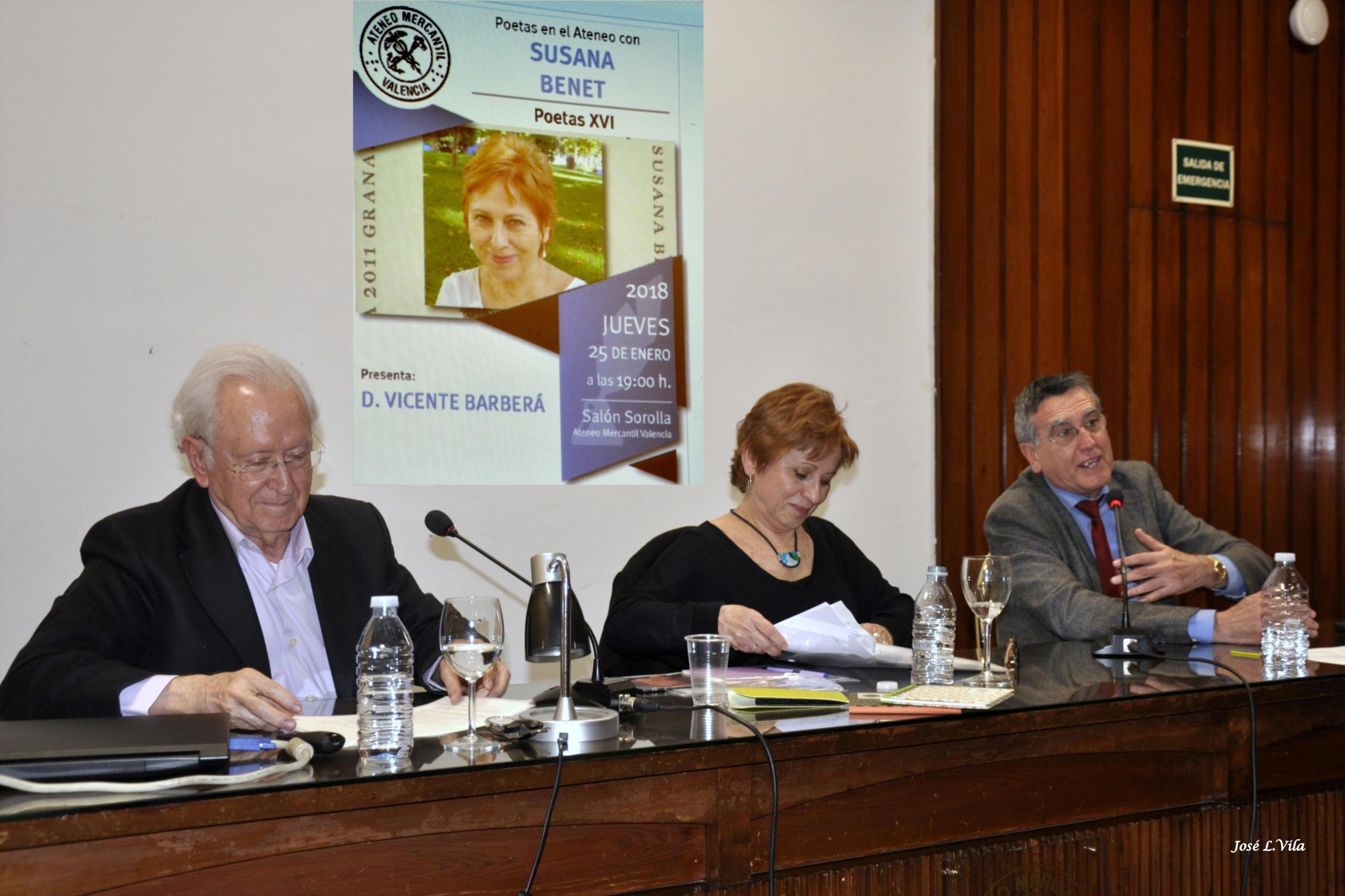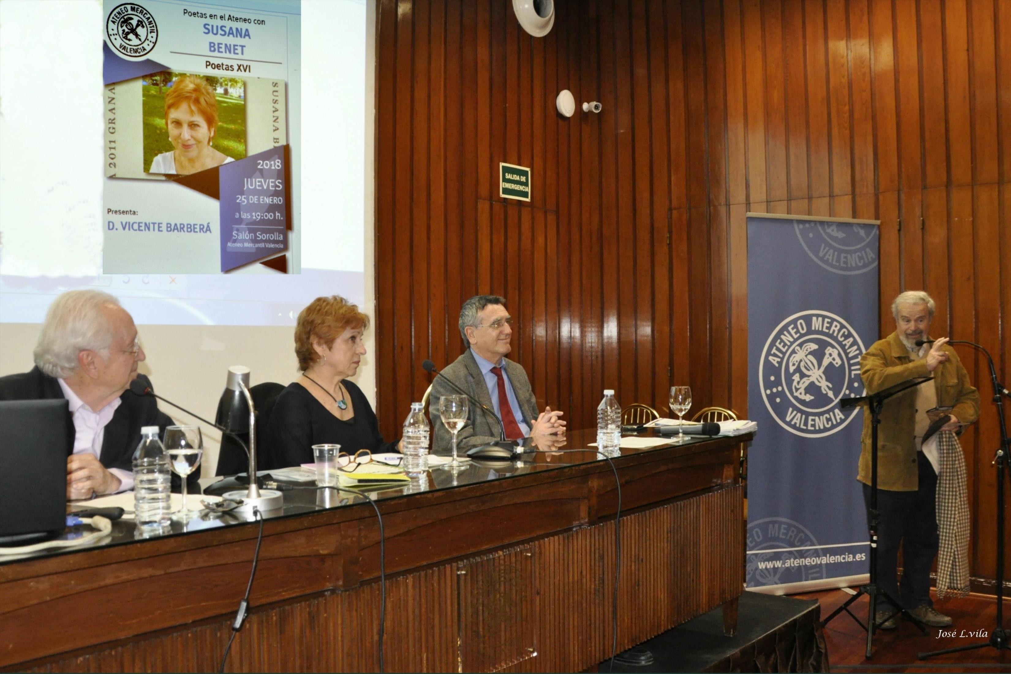 La poeta valenciana Susana Benet fue la protagonista de la XVI edición de Poetas en el Ateneo, celebrada el pasado jueves 25 de enero, de 2018. Presentó el acto Vicente Bosch y lo condujo magistralmente, como siempre, Vicente Barberá.