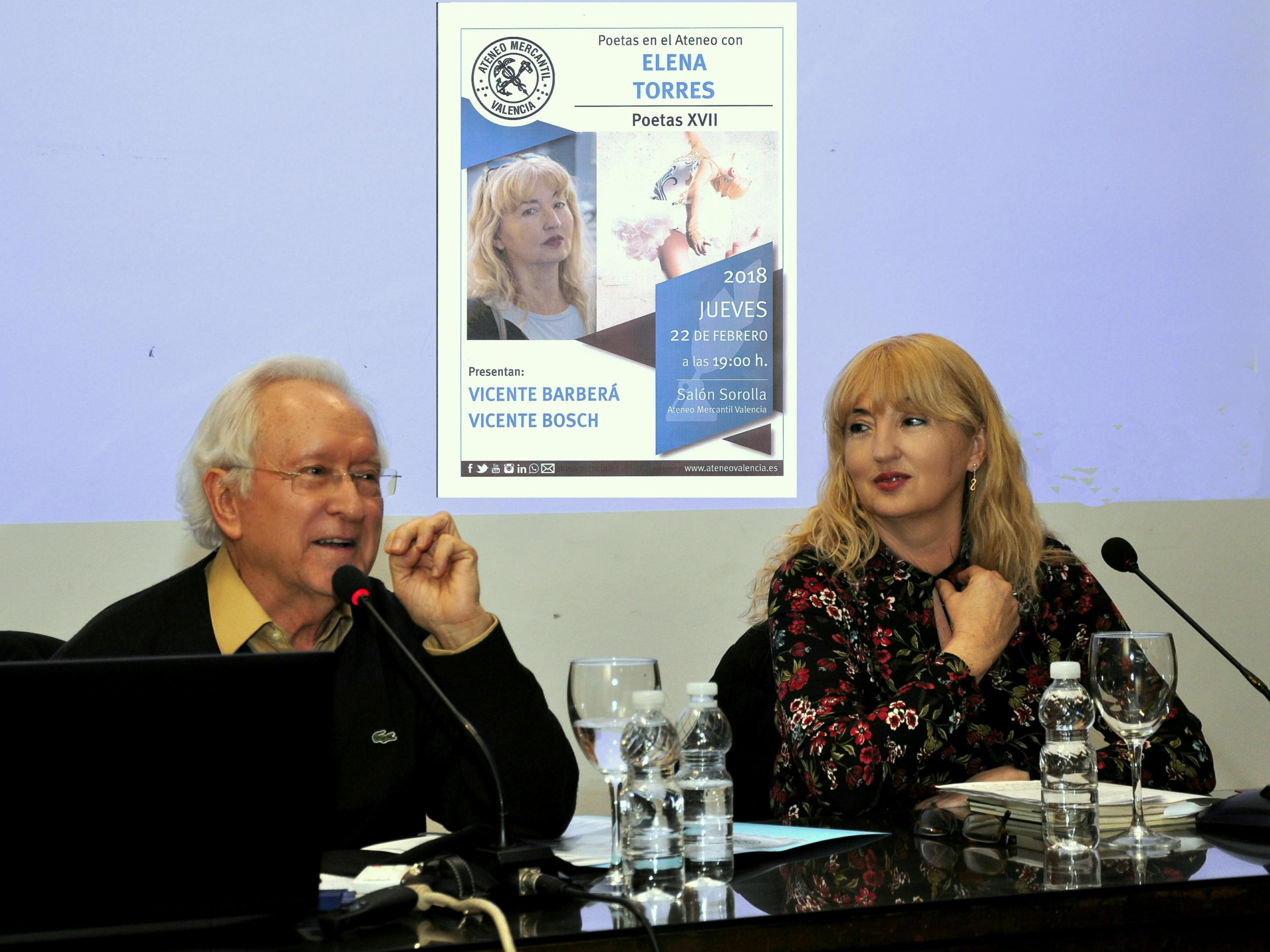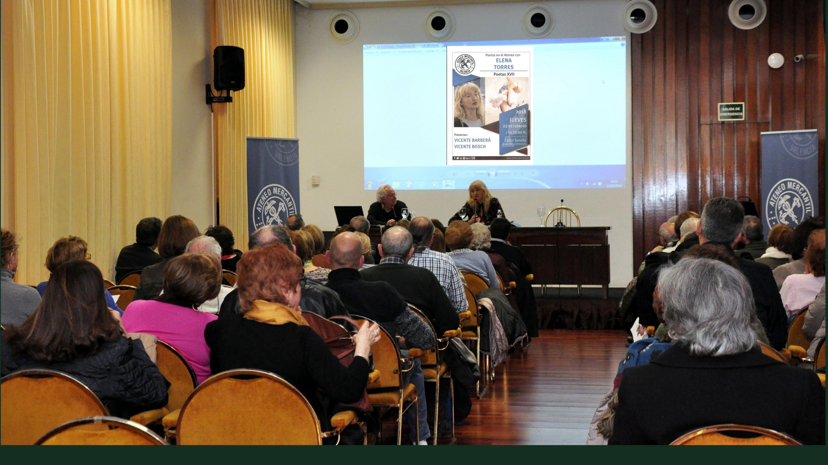 La XVII edición de “Poetas en el Ateneo”, celebrada el pasado 22 de febrero, tuvo como protagonista a la poeta valenciana Elena Torres. Presentó el acto Vicente Barberá, a quien en esta ocasión no acompañó Vicente Bosch, que se encontraba fuera de Valencia.