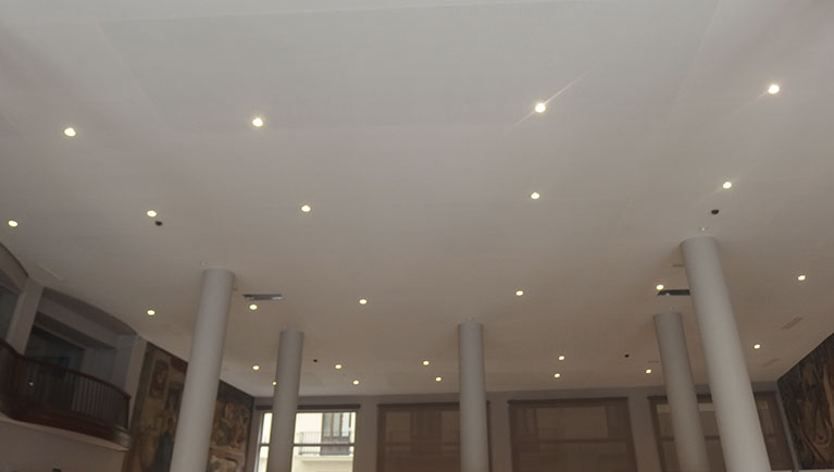 De esta manera los socios podrán disfrutar de unas instalaciones mejoradas. Tras la retirada del anterior techo se han llevado a cabo una serie de obras necesarias para adaptarnos a la normativa técnica. Además, se han instalado nuevas luminarias de servicio y decorativas, se han cableado las nuevas luminarias, se ha ignifugado el techo, las vigas y todas las partes metálicas existentes,se ha recolocado la impulsión y el retorno de la climatización de todo el salón, se ha cableado el salón entre el balcón del Bridge y el antiguo piano, seha cambiado toda la instalación eléctrica para futuras actuaciones y eventos y por último se instalaron de detectores de humo y contra incendios y se colocó el nuevo techo de escayola.