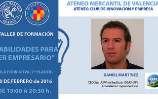 El Ateneo Club de Innovación y Empresa ha organizado el I Taller para Emprendedores “De la Idea a la Empresa”, que constará de cinco sesiones de formación de 3 horas cada una (de 18.00 a 21.00 horas), cada miércoles del 10 de febrero hasta el 9 de marzo. Todas las sesiones serán en el Aula Formativa de la séptima planta. La entrega de credenciales será el 6 de abril de 2016. Número de plazas: 15 alumnos.