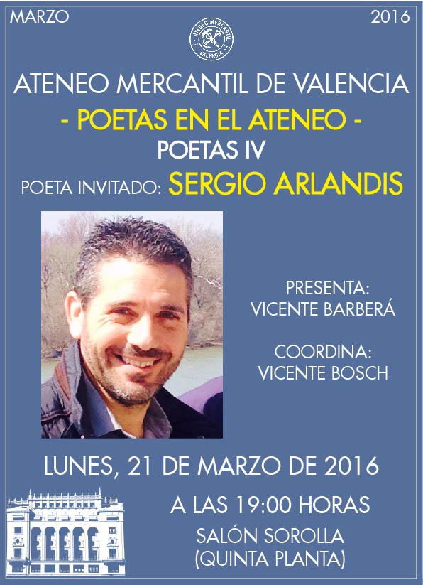 El día 21 de marzo ha tenido lugar en la sala Sorolla del Ateneo Mercantil de Valencia una nueva lectura homenaje a un poeta valenciano, esta entrega, en el día mundial de la poesía, la protagonizó el joven poeta, profesor y crítico, Sergio Arlandis.