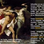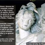 Por su parte, las Erinias eran diosas de la venganza que tenían una insaciable necesidad de vengar todo tipo de injusticias que los dioses y los mortales cometían entre ellos dentro del seno familiar. Ellas personificaban la culpa creada por los crímenes que las leyes humanas no podían castigar. Son descritas como ancianas con cabellos de serpiente, cabezas de perro, alas de murciélago y ojos rojos; portaban látigos con puntas de metal, con los cuales azotaban a sus victimas hasta la muerte.