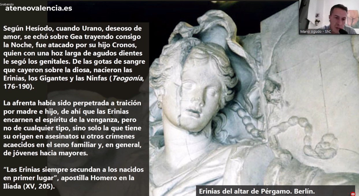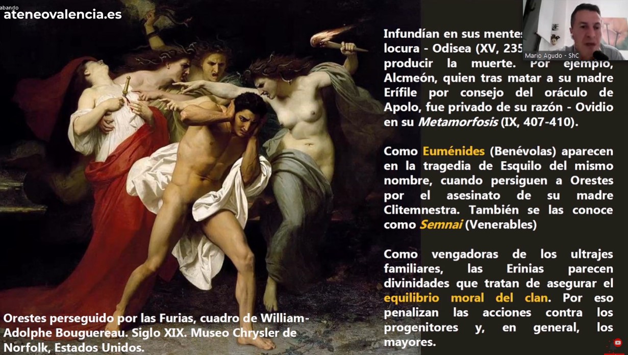 Por su parte, las Erinias eran diosas de la venganza que tenían una insaciable necesidad de vengar todo tipo de injusticias que los dioses y los mortales cometían entre ellos dentro del seno familiar. Ellas personificaban la culpa creada por los crímenes que las leyes humanas no podían castigar. Son descritas como ancianas con cabellos de serpiente, cabezas de perro, alas de murciélago y ojos rojos; portaban látigos con puntas de metal, con los cuales azotaban a sus victimas hasta la muerte.